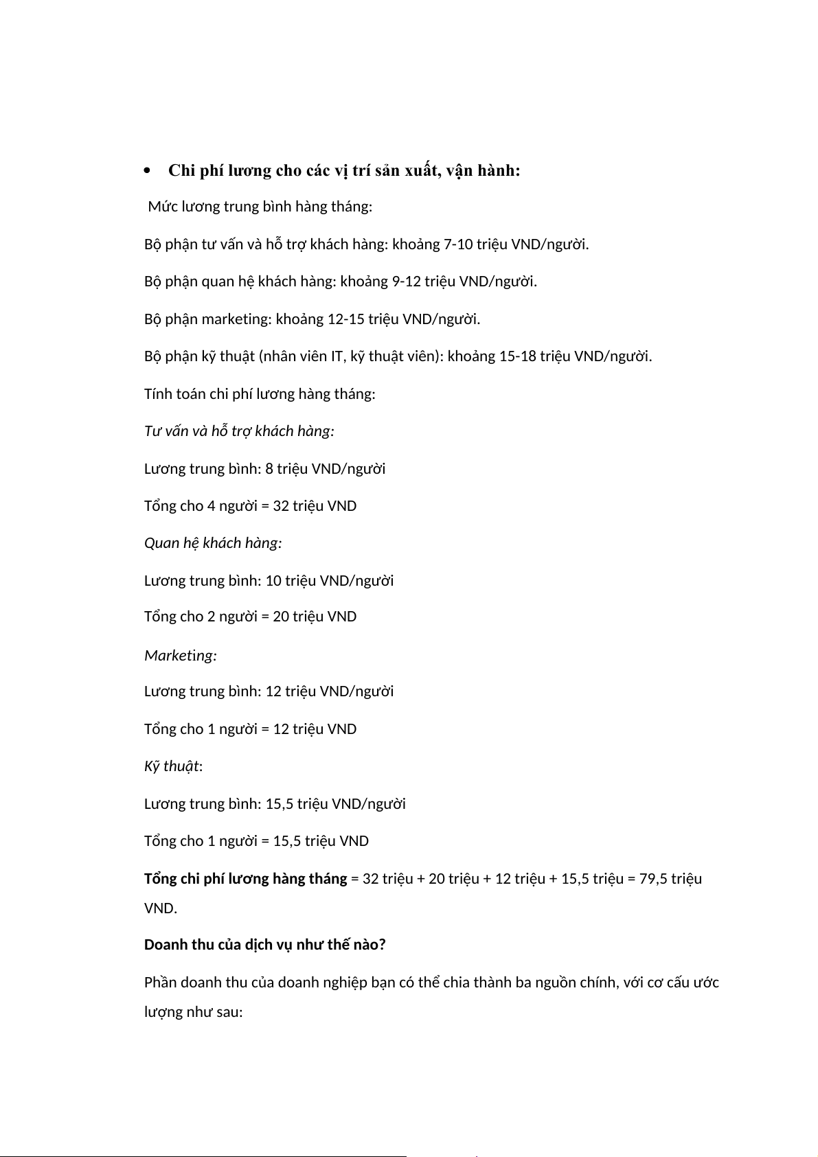 Tổng chi phí lương hàng tháng = 32 triệu + 20 triệu + 12 triệu + 15,5 triệu = 79,5 triệu VND.