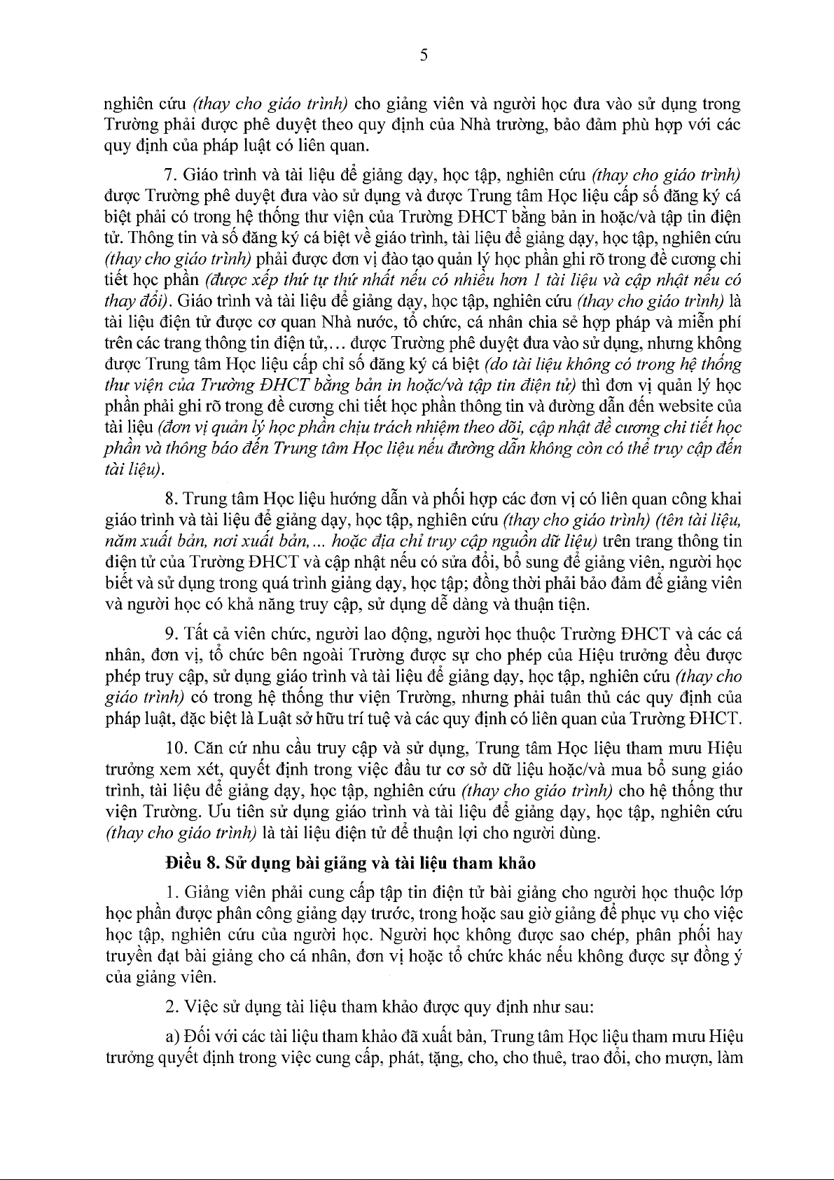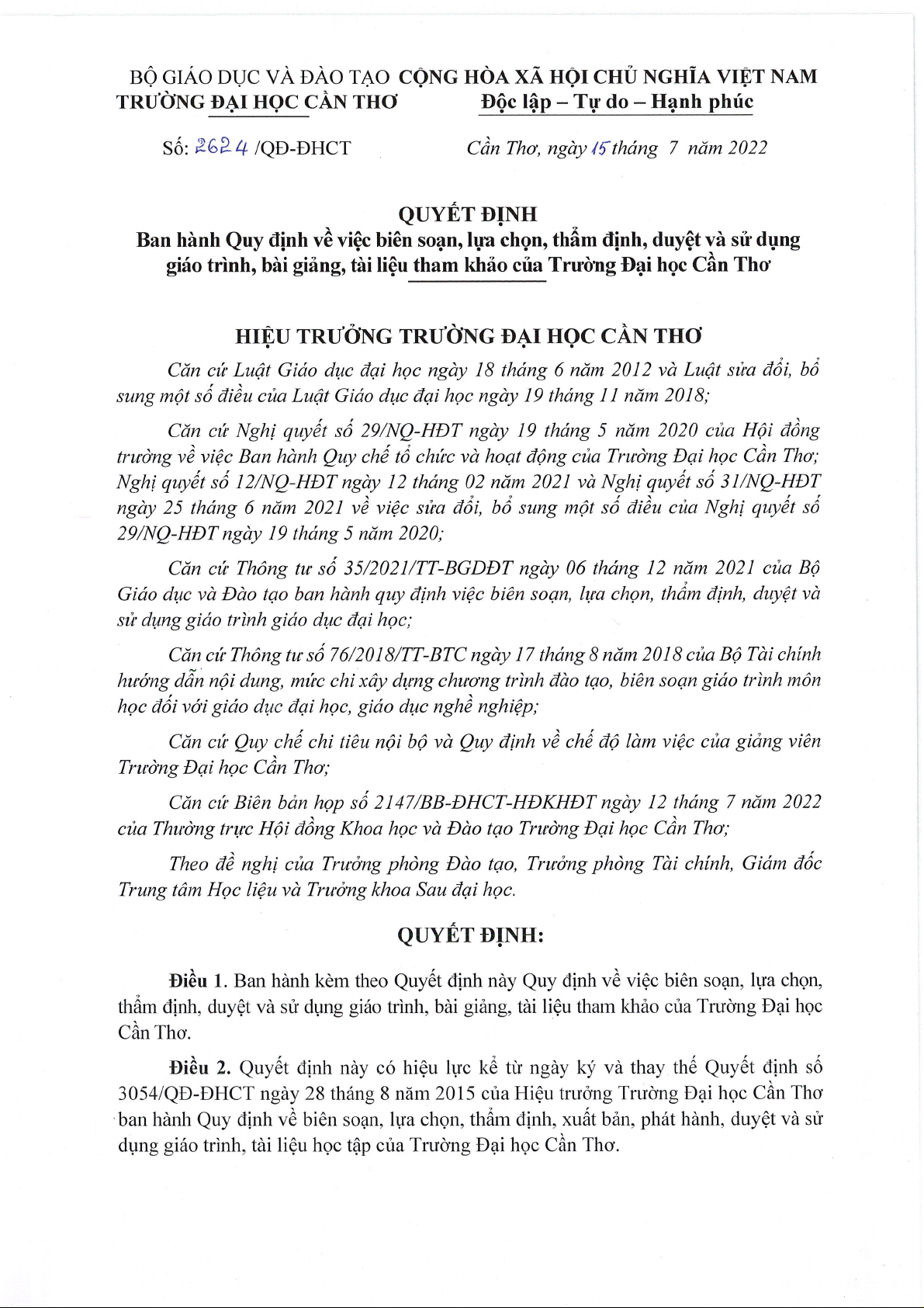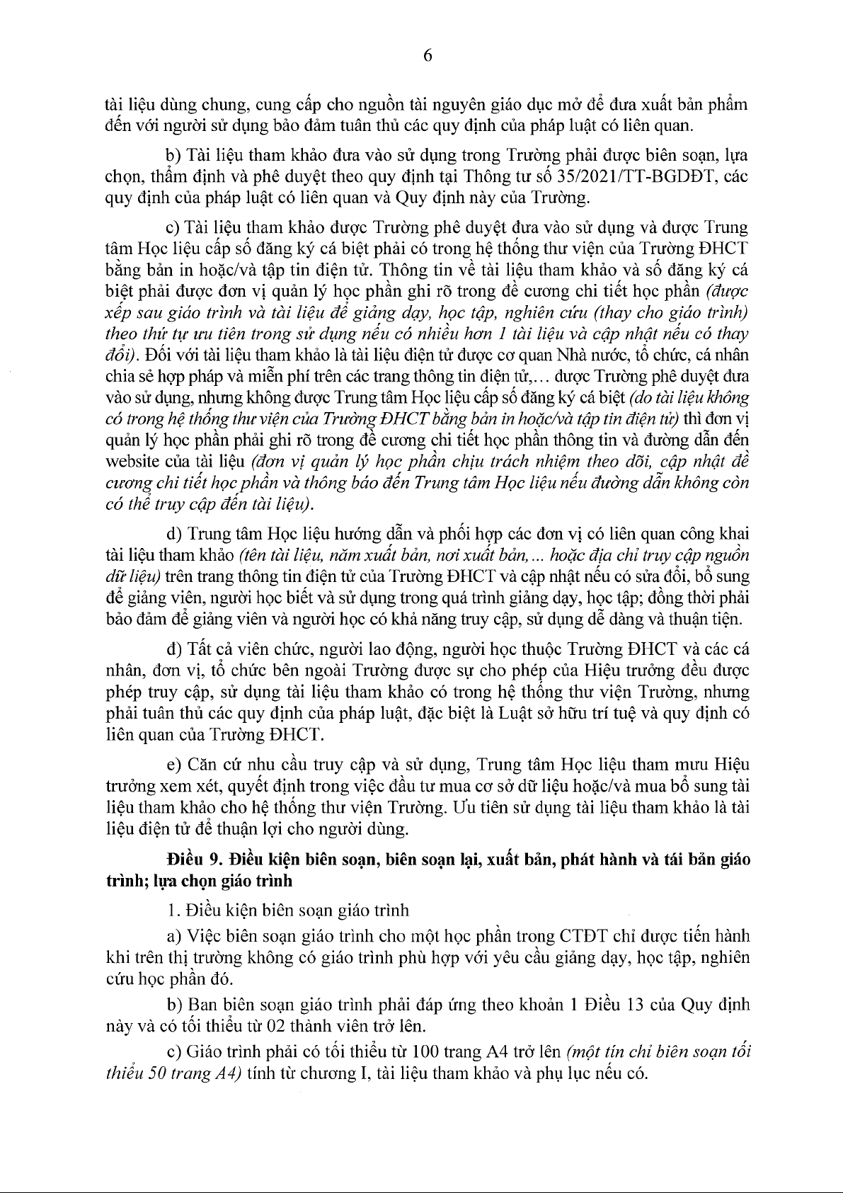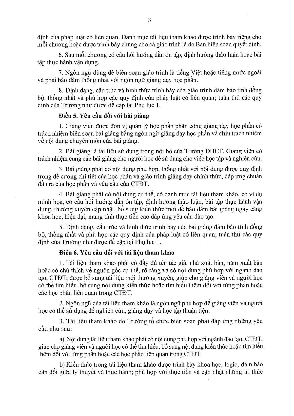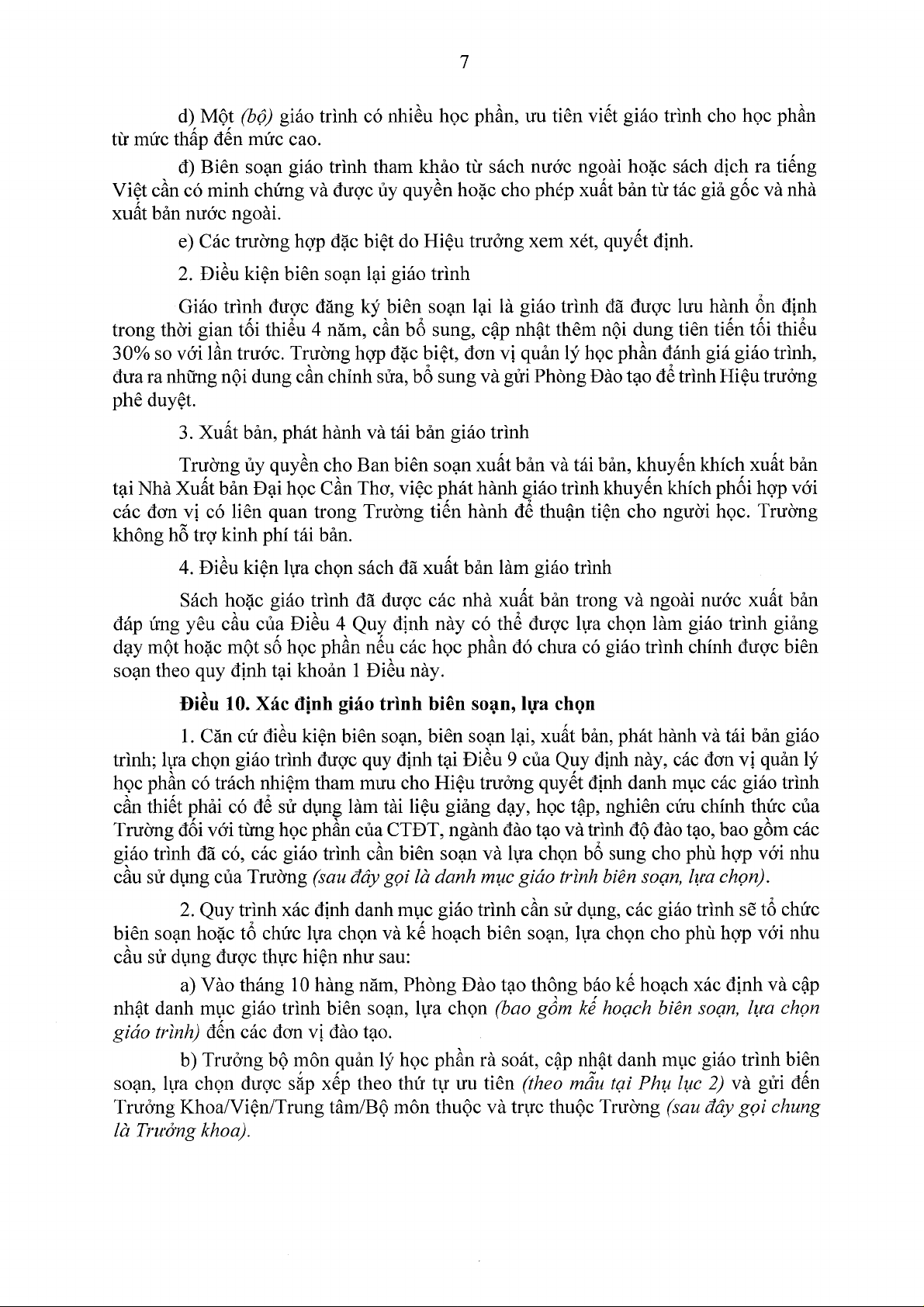 Quyết định Ban hành quy định về việc biên soạn, lựa chọn, thẩm định, duyệt và sử dụng giáo trình, bài giảng, tài liệu tham khảo của Trường Đại học Cần Thơ