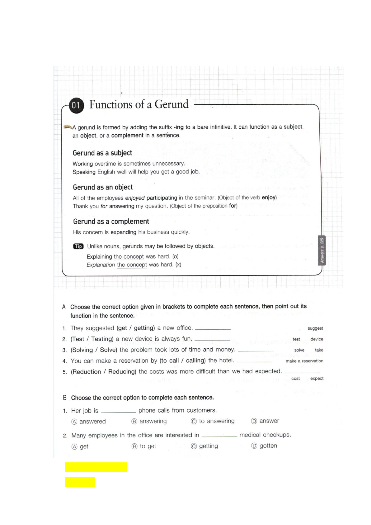FUNCTIONS OF A GERUND - VERBS FOLLOWED BY A GERUND A. 1B,2B,3A,4B,5B B. 1B,2C 10