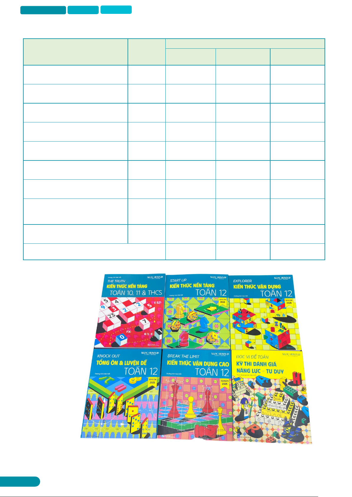 Nền tảng Toán 11, 10 & THCS cần thiết STARTUP Sách in x Không học x Nền tảng Toán 12 EXPLORER Sách in x x x Vận dụng Toán 12 BREAK THE LIMIT Sách in Không học x x Vận dụng cao Toán 12 KNOCKOUT 9+ Sách in Không học x x