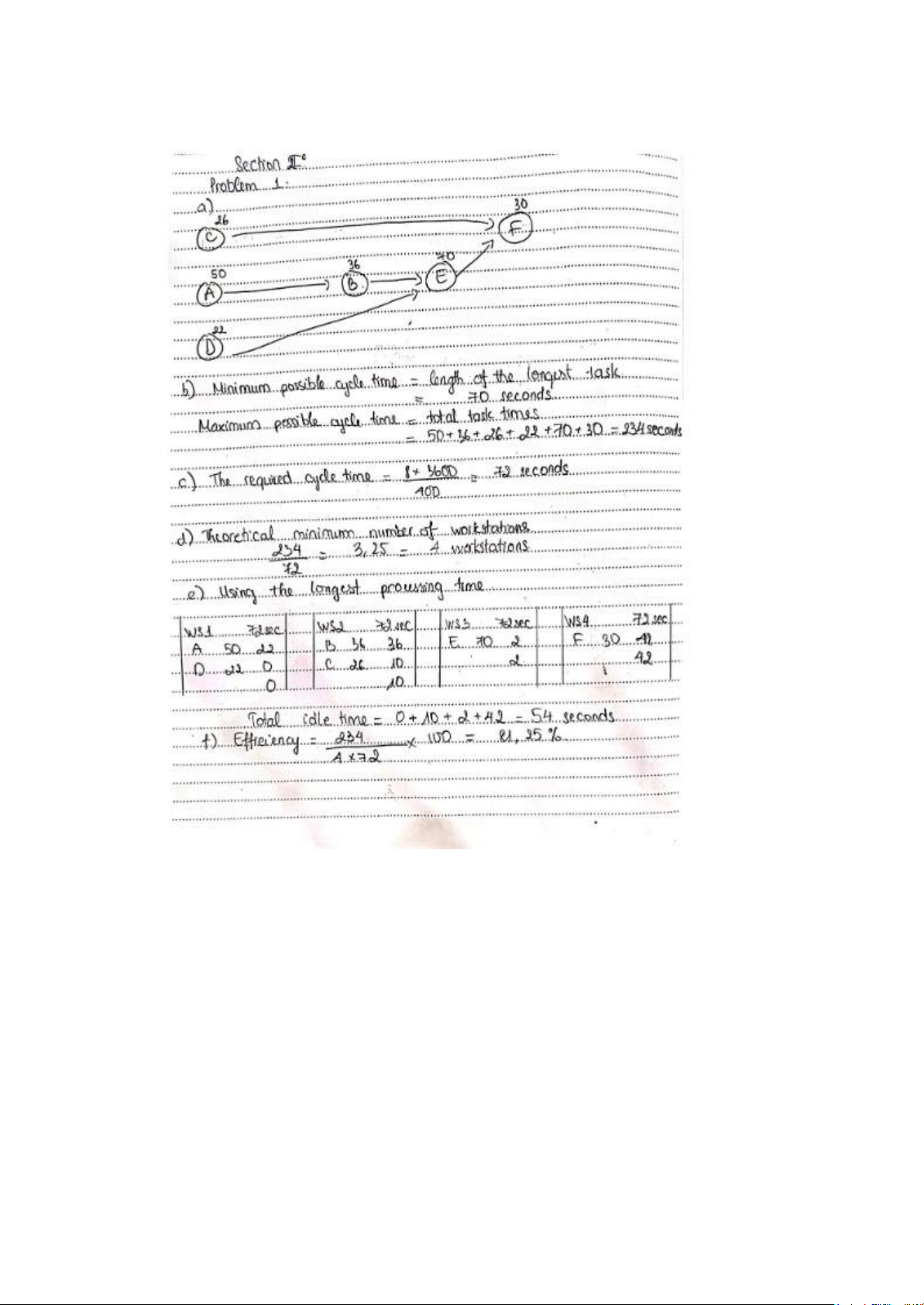 units per day. The tasks necessary to produce this product are detailed in the table below: Task Predecessor Time (seconds) A - 50 B A 36 C - 26 D - 22 E B, D 70 F C, E 30