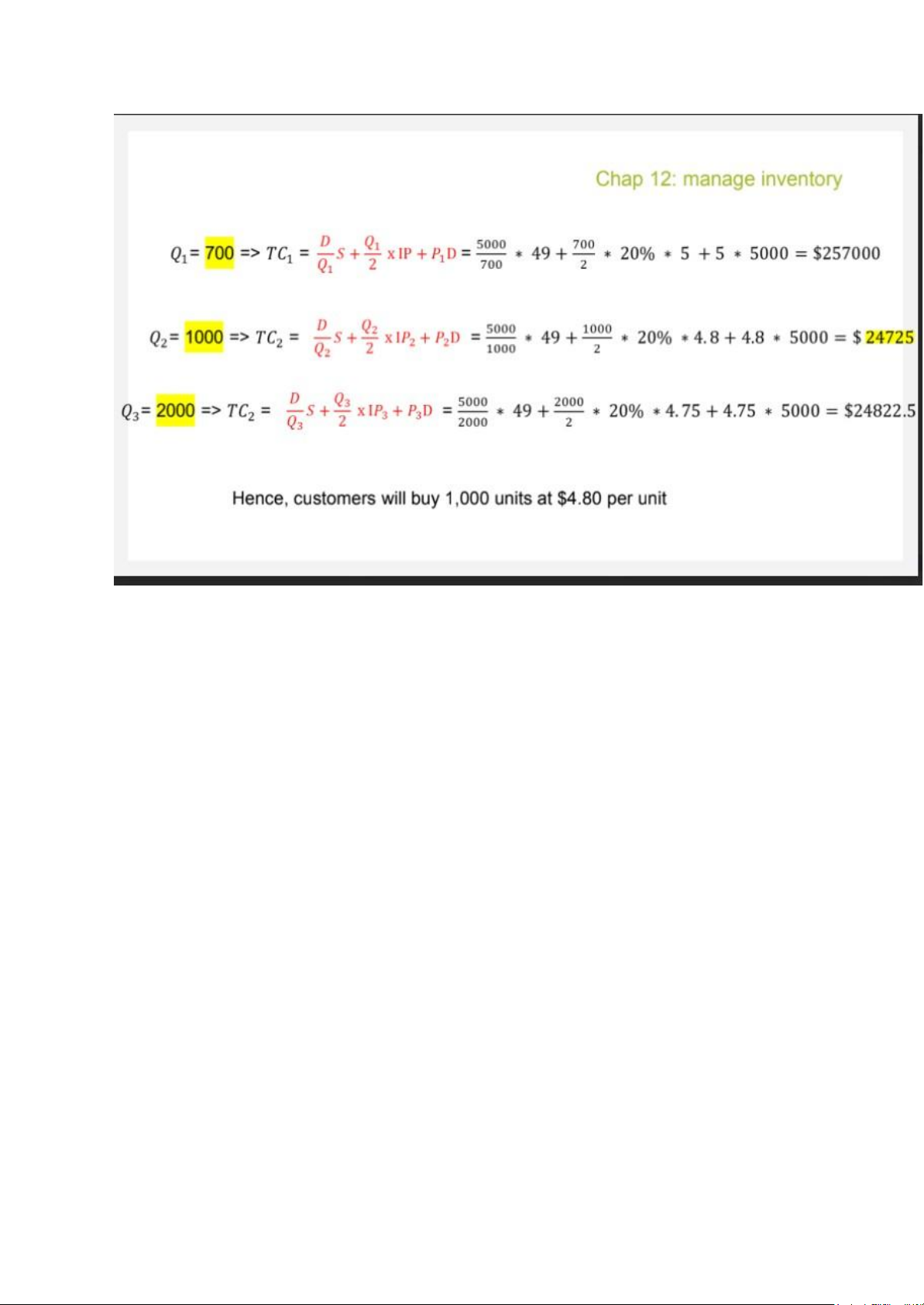 or more units, the unit cost is only $4.75. Furthermore, ordering cost is $49.00