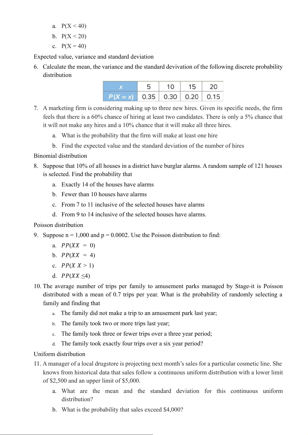 6. Calculate the mean, the variance and the standard devivation of the following discrete roba p bility distri u b tion