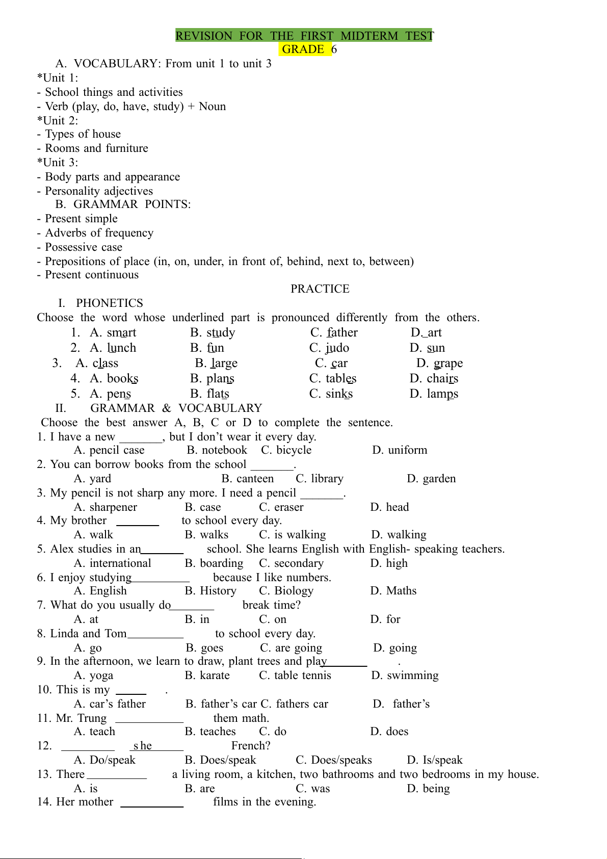 REVISION FOR THE FIRST MIDTERM TEST GRADE 6