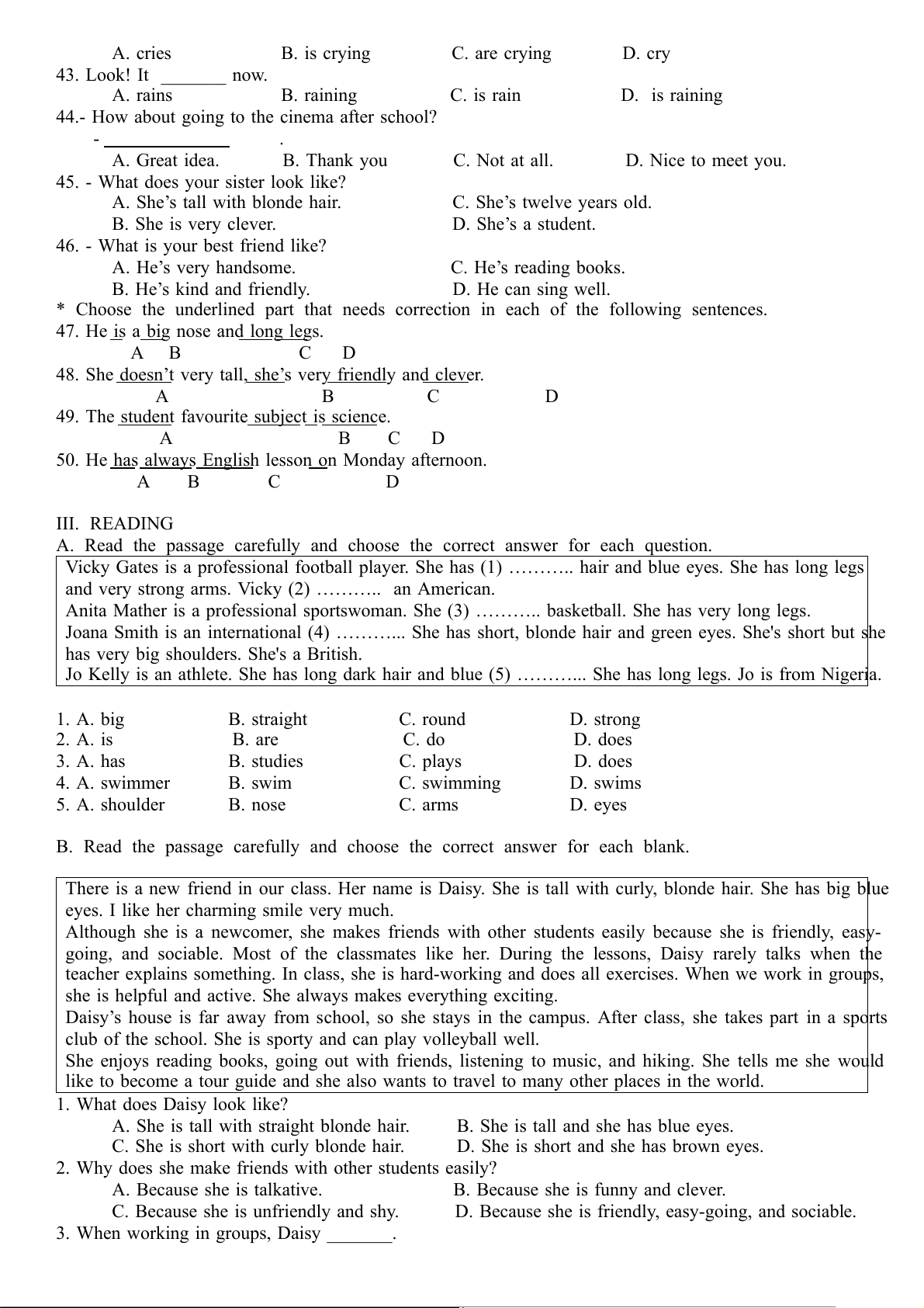 Jo Kelly is an athlete. She has long dark hair and blue (5) ………... She has long legs. Jo is from Nigeria. 1. A. big B. straight C. round D. strong 2. A. is B. are C. do D. does 3. A. has B. studies C. plays D. does 4. A. swimmer B. swim C. swimming D. swims 5. A. shoulder B. nose C. arms D. eyes