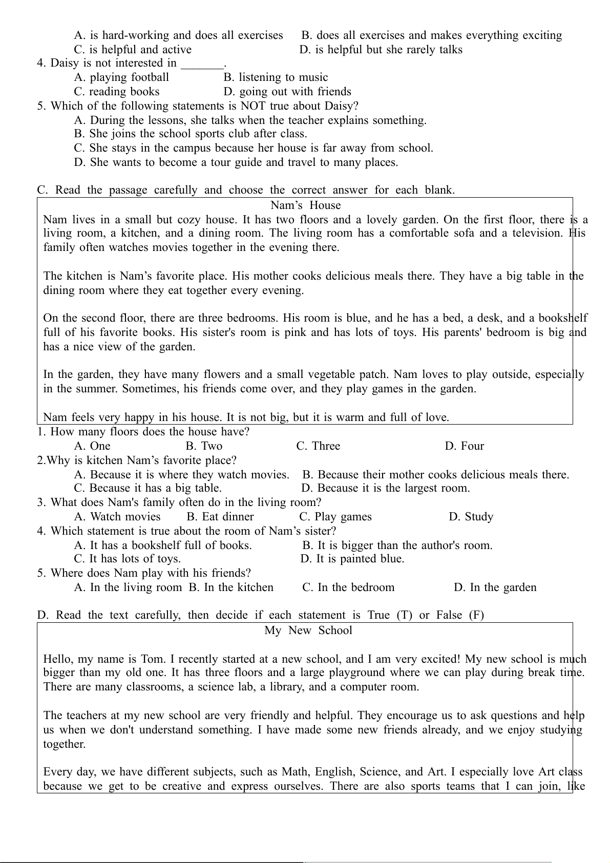 C. Read the passage carefully and choose the correct answer for each blank. Nam’s House