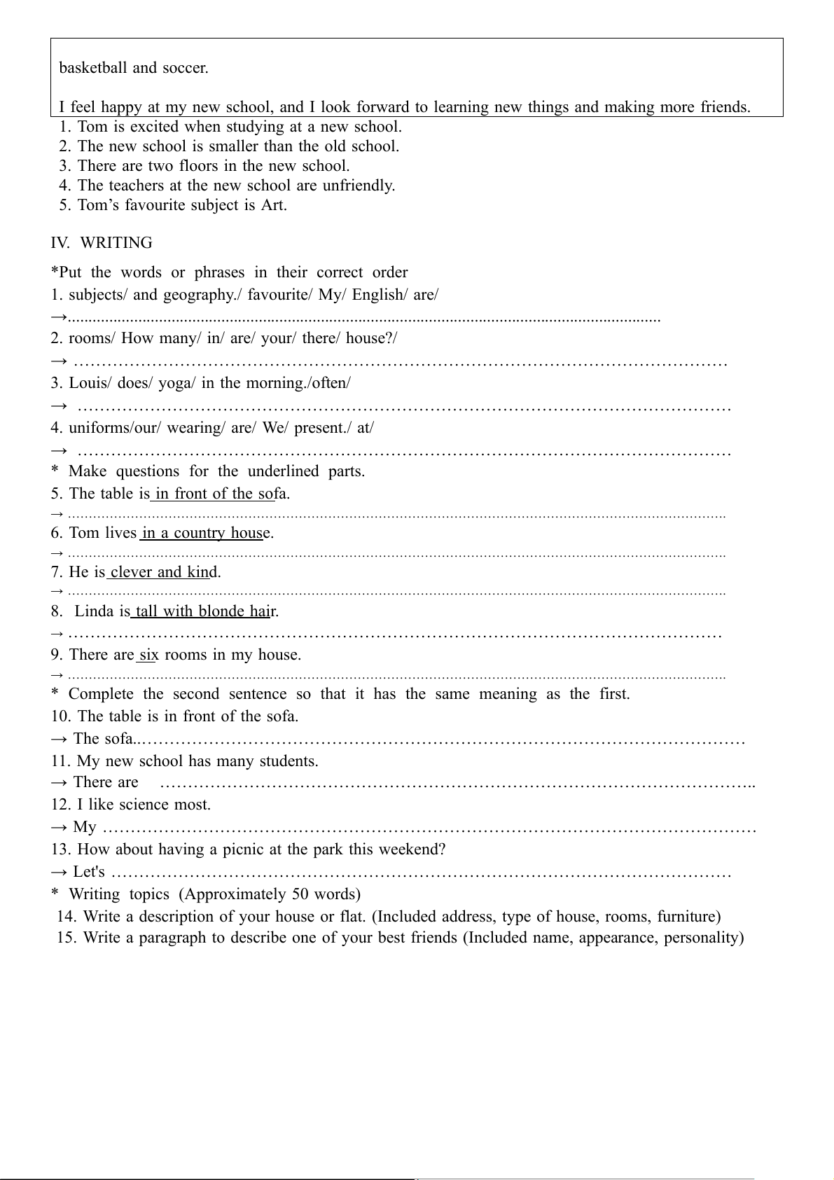 5. Tom’s favourite subject is Art. IV. WRITING