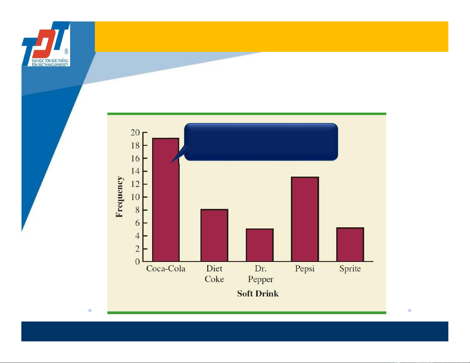 • Example: Relative and Percent Frequency Distribution of Soft Drink Purchases Soft drink frequency Rel. freq Percent frequency (%) Coca-Cola 19 0.38 0.38*100 = 38 Diet Coke 8 0.16 ? Dr. Pepper 5 0.10 ? Pepsi 13 0.26 ? Sprite 5 0.10 ? Total 50 1.0 ? 13 Bar chart -1