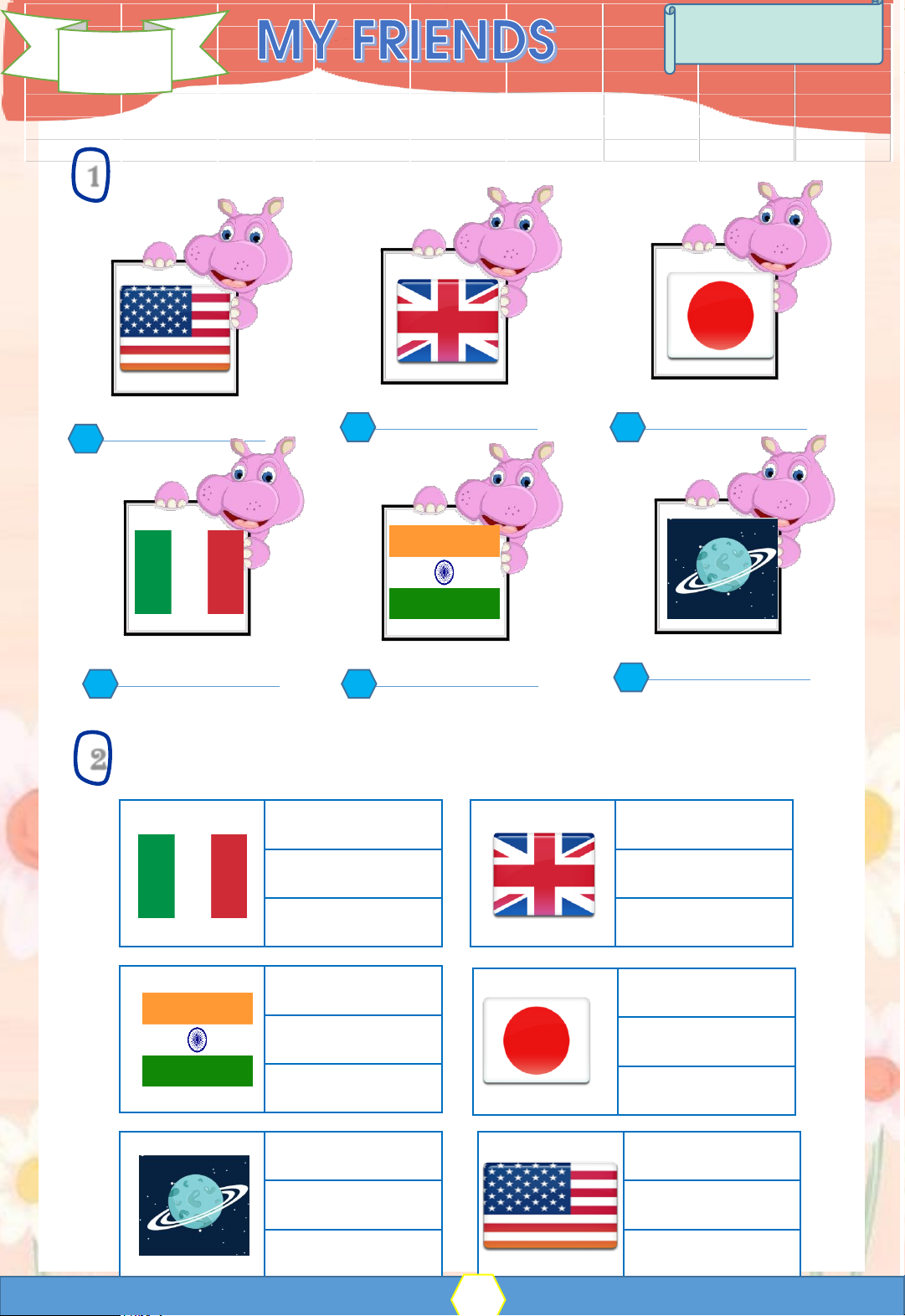 Look and write the missing word. 1 2 _ _ ace _ _fie 3 2 _ _ ell N_ck 17 I learn smart start 3 LESSON 2 UNIT 1 Unit 1 Lesson 2 1 Look and write. 1 2 3 4 5 6 2 Look and circle. Italy The USA India The UK Alpha Alpha Italy The USA India The UK Alpha Japan Alpha The USA India The UK Japan Japan 18 I learn smart start 3