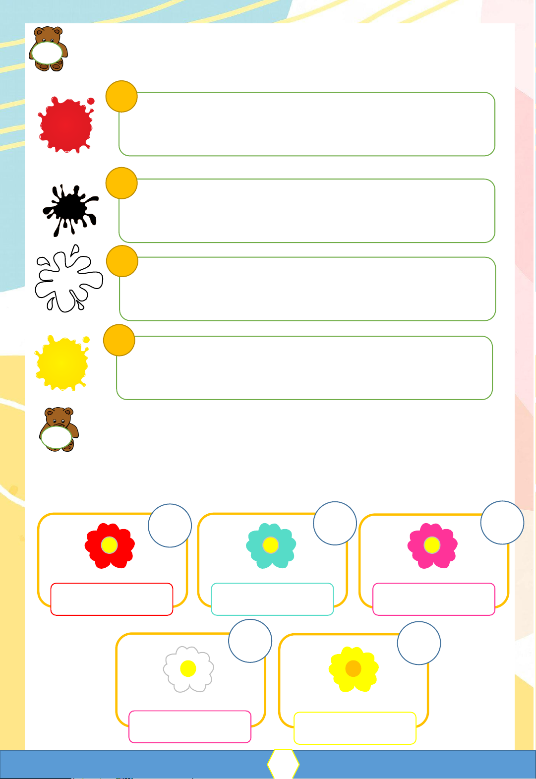 What is the next. Read and circle.. 1 Close your book Open your book 2 Hands down Stand up 3 Hands up Open your book 4 Close your book Sit down 4 I learn smart start 3 5 Read and circle the picture... 1 Open the book 2 close the book 3 Hands up 4 Hands down o 5 Stand up 6 Listen and tick. 1 2 3 4 5 I learn smart start 3 Lesson 3 1 Read and answer. 1 2 3 What is your name? What is your name? What is your name? ________________ ________________ ________________ 4 5 o What is your name? What is your name? ________________ ________________ 2 Look and match. Lucy Goodbye Hello Tom 6 I learn smart start 3 3 Read and tick or cross. Hello Hello Tom Lucy Nick Alfie 4 Reorder the words o your/ open/ please/ book. 1 Is/ What/ your/ name/?/ 2 My/ is/ name/ Nick. 3 Close/book/ your/please. 4 7 I learn smart start 3 Lesson 4 1 Look and write. 1 2 3 4 6 5 o 2 Read and circle.. Pink Yellow White White Blue Yellow Black Red 8 I learn smart start 3 3 Read and circle.. 1 blue red yellow 2 Black red yellow 3 Black red white 4 Black Yellow white o 4 Read and ti c or cross It’s a red flower. It’s a yellow flower. It’s a pink flower It’s a blue flower. It’s a yellow flower. 9 I learn smart start 3 5
