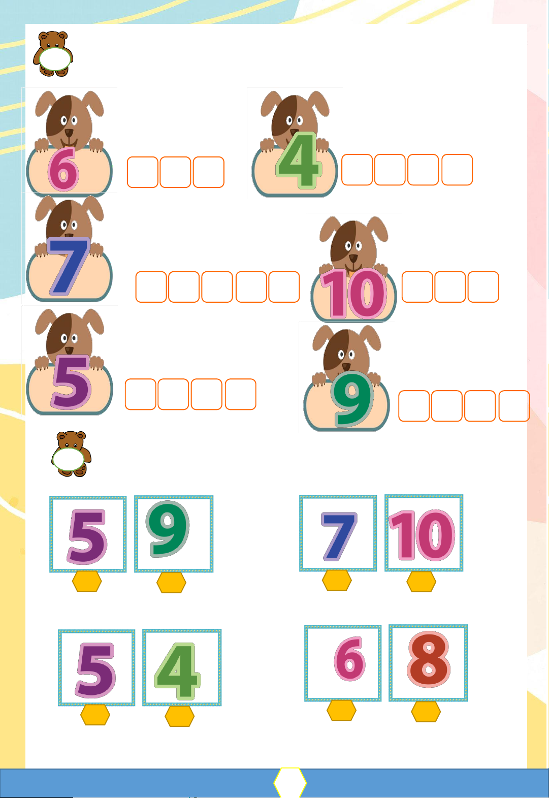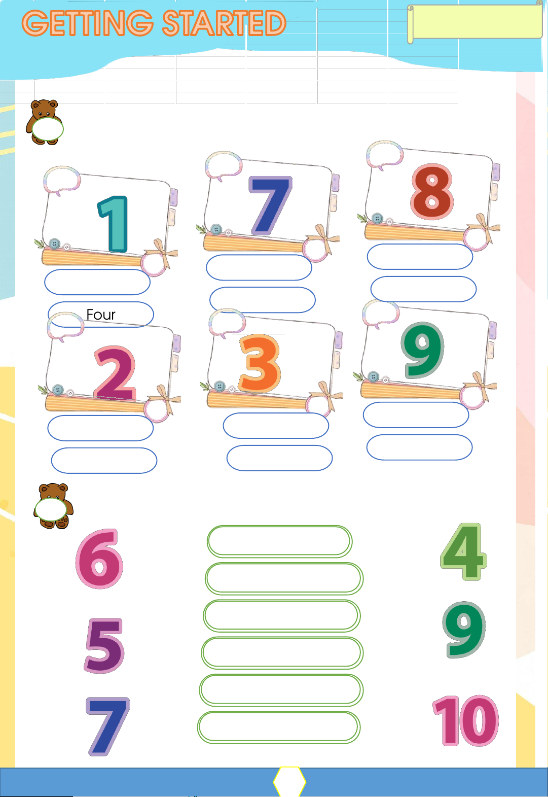 Fill in the blanks. Use the word in the box. Color blue name yes is what What ___ is this? What is your name? 1 4 It is red My _________ is Tom What color is this? _____ is your name? 2 It is ____________ 5 My name is Sue. What color is this? Open your book, please 3 It ____________yellow. 6 ________, teacher o 6 Listen and number. 1 10 I learn smart start 3 REVIEW 1 Read and color. Eight Seven One Nine Eight Four o Ten One Five Nine Two Three 2 Read and match I’m ten years old. I’m nine years old. I’m six years old. I’m seven year old. I’m five years old. I’m four year old. 11 I learn smart start 3 3 Write the missing letters. x o s e e o e 4 Listen and tick. 1 2 3 4 12 I learn smart start 3 5 Look and write. 1 2 3 Anna/ 10 Ben/ 9 Lisa/ 8 4 5 Tom/ 5 Sue/ 4 1. My name is Anna. o She is ten years old.
