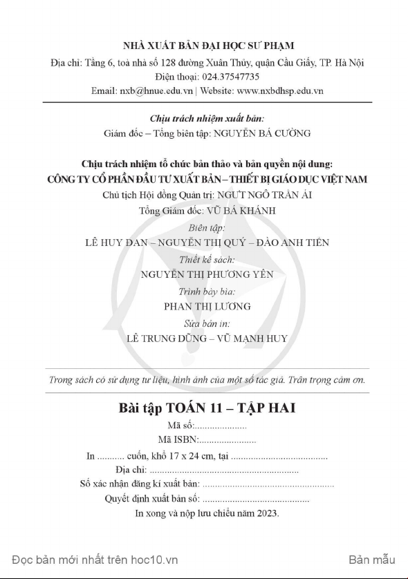 Sách bài tập Toán 11 (tập 2) (Cánh Diều) được biên soạn bởi các tác giả: Đỗ Đức Thái (Tổng Chủ biên kiêm Chủ biên), Phạm Xuân Chung, Nguyễn Sơn Hà, Nguyễn Thị Phương Loan, Phạm Sỹ Nam, Phạm Minh Phương.