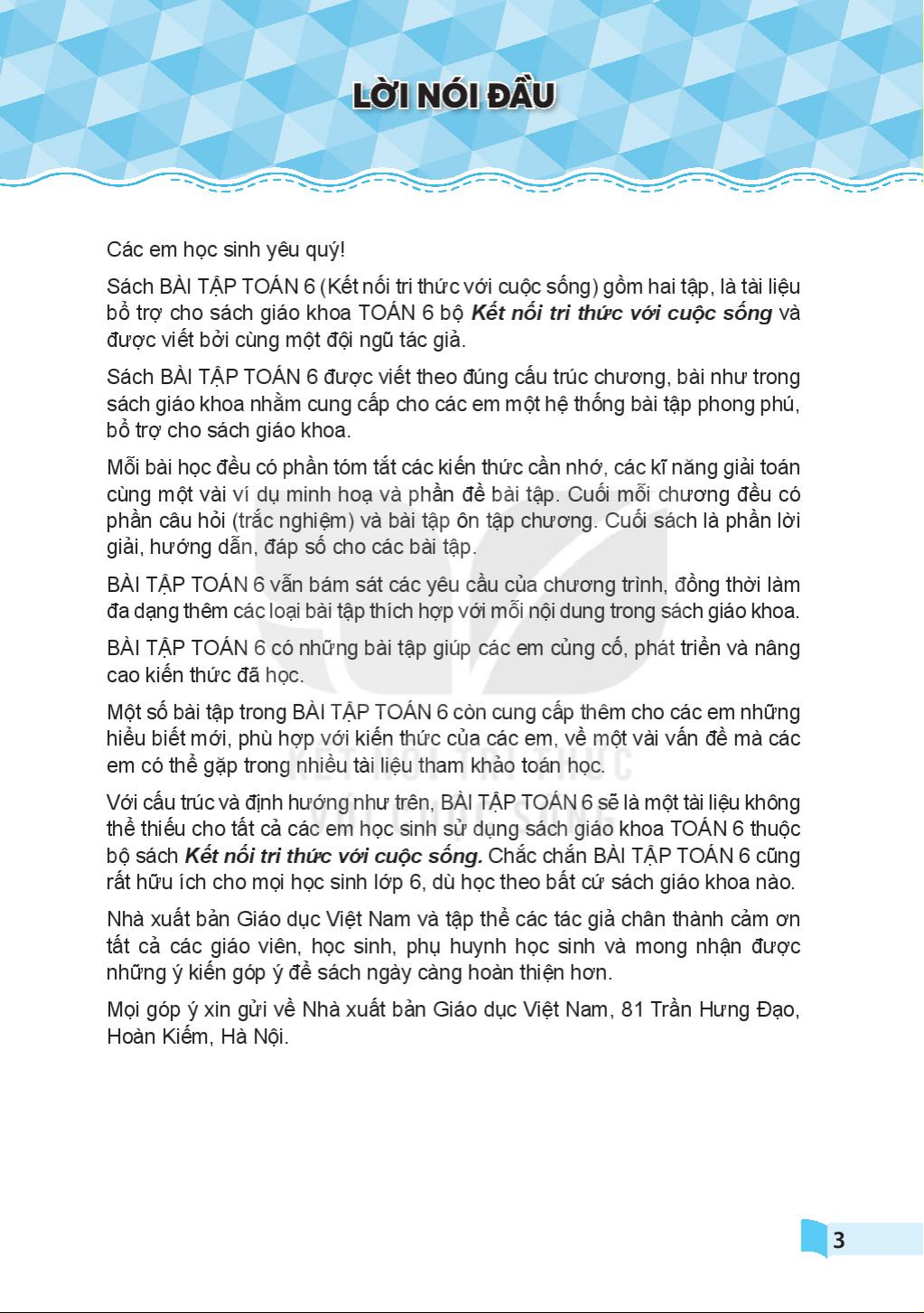 Sách BÀI TẬP TOÁN 6 được viết theo đúng cấu trúc chương, bài như trong sách giáo khoa nhằm cung cấp cho các em một hệ thống bài tập phong phú, bổ trợ cho sách giáo khoa.