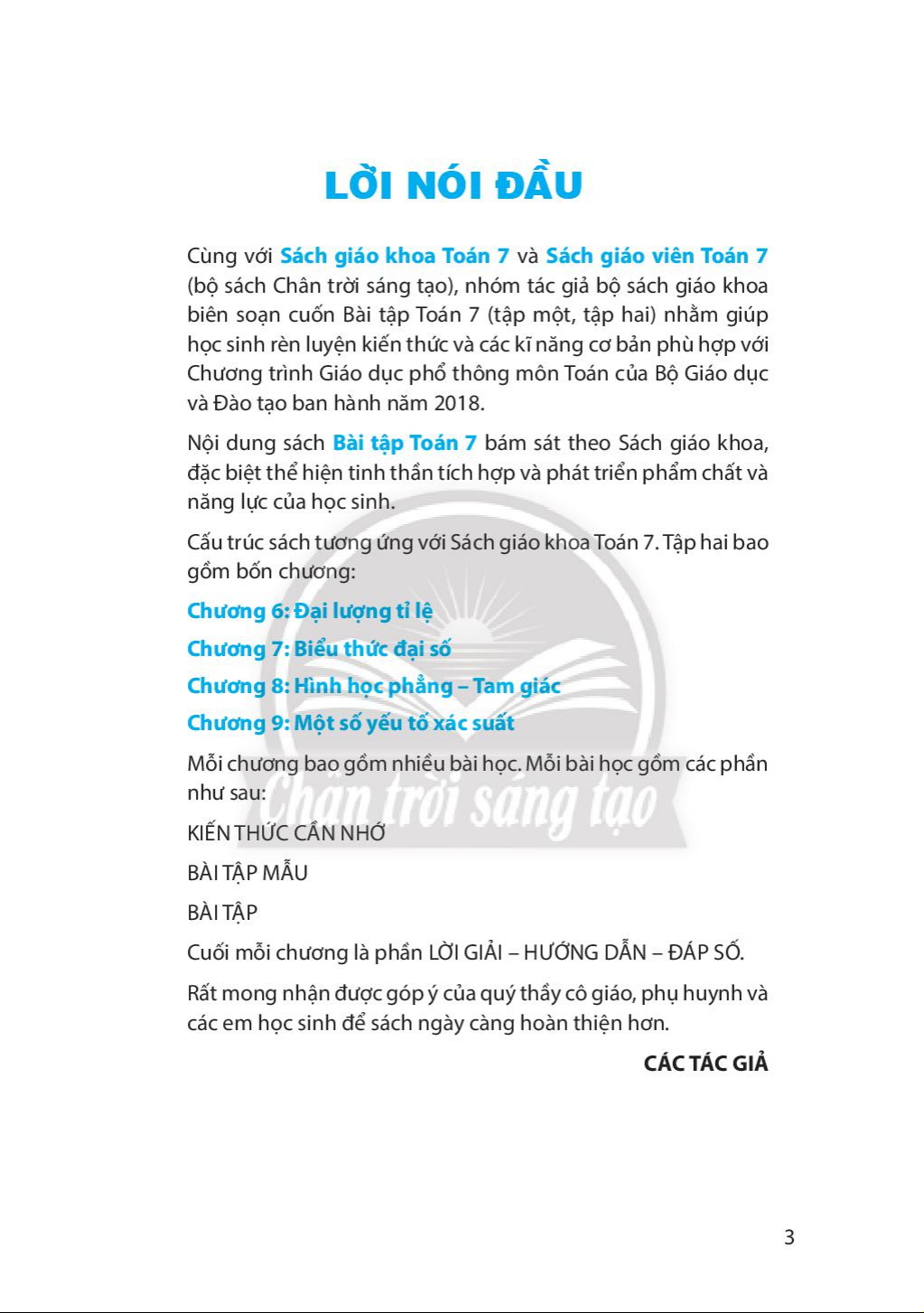 Cùng với Sách giáo khoa Toán 7 và Sách giáo viên Toán 7 (bộ sách Chân trời sáng tạo), nhóm tác giả bộ sách giáo khoa biên soạn cuốn Bài tập Toán 7 (tập một, tập hai) nhằm giúp học sinh rèn luyện kiến thức và các kĩ năng cơ bản phù hợp với Chương trình Giáo dục phổ thông môn Toán của Bộ Giáo dục và Đào tạo ban hành năm 2018.