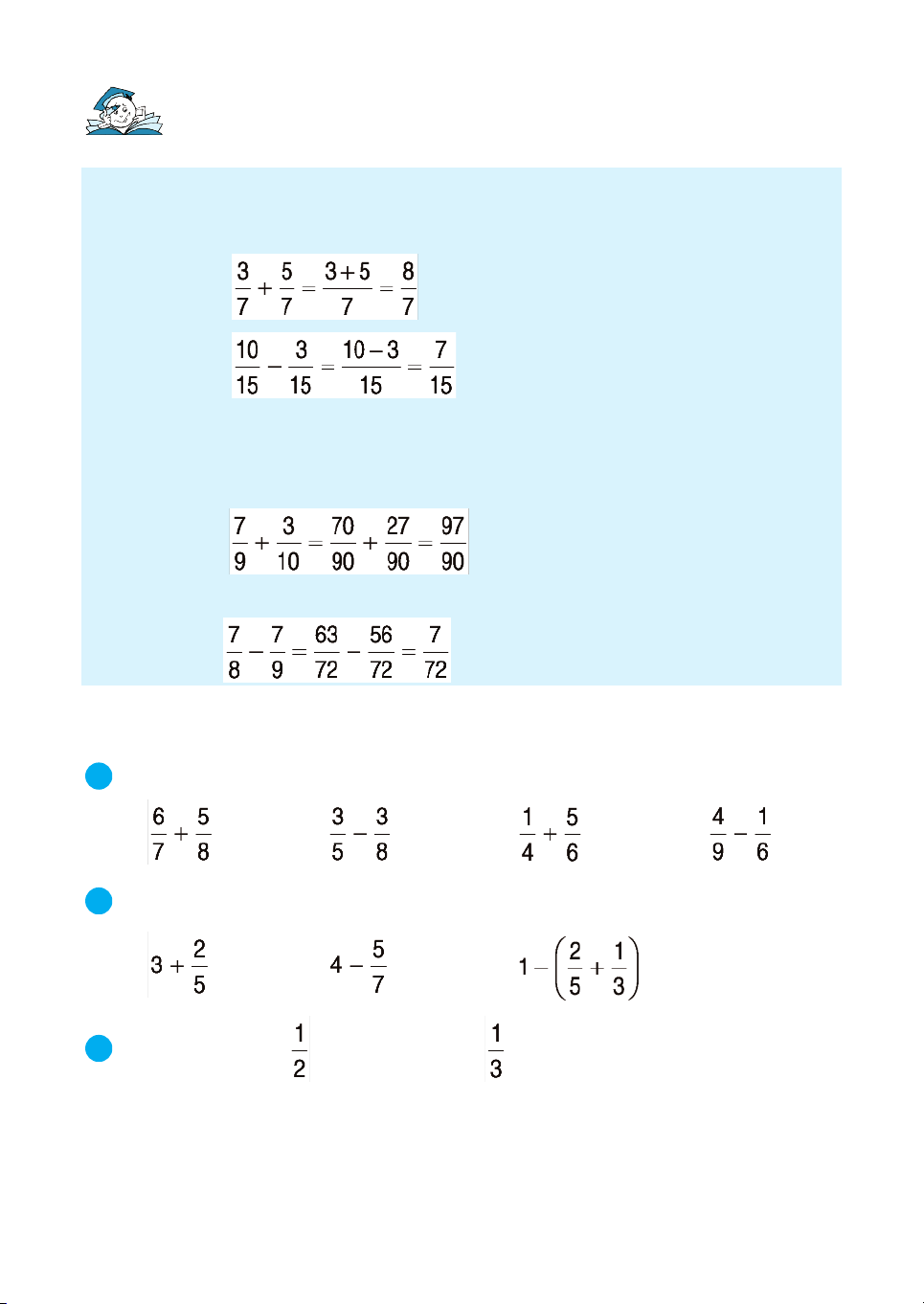 råi céng (hoÆc trõ) hai ph©n sè ®· quy ®ång mÉu sè. VÝ dô 1 : . VÝ dô 2 : . 1 TÝnh : a) ; b) ; c) ; d) . 2 TÝnh : a) ; b) ; c) . 3