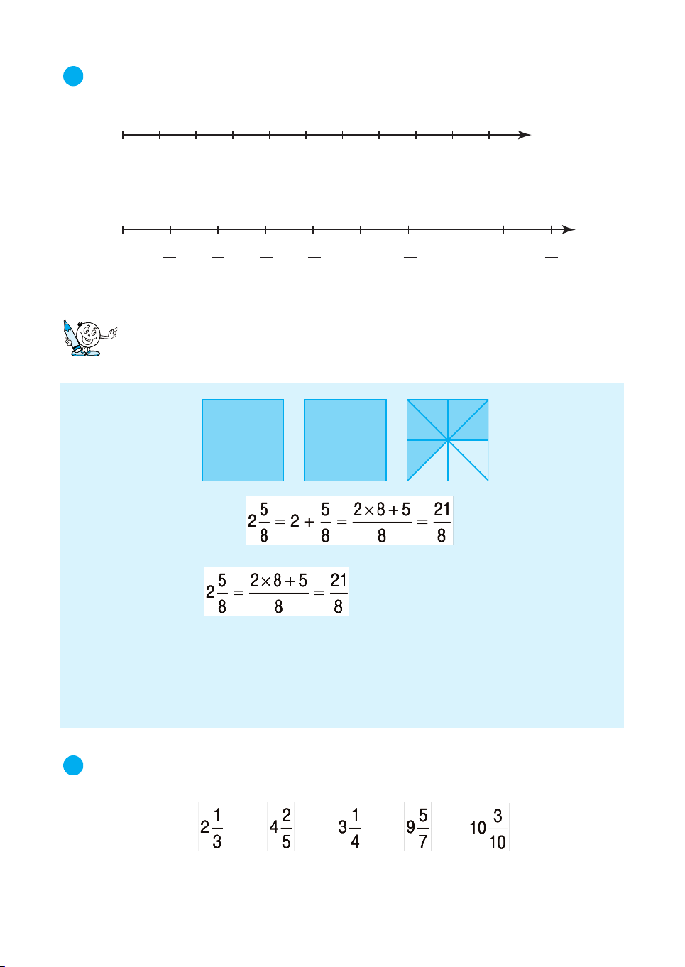 2 ViÕt hçn sè thÝch hîp vµo chç chÊm dðíi mçi v¹ch cña tia sè : 0 1 2 a) 1 2 3 4 5 1 10 1 ... ... ... 5 5 5 5 5 5 5 0 1 2 3 b) 1 2 3 1 6 9 ... ... ... 1 3 3 3 3 3 3 Hçn sè (tiÕp theo) . Ta viÕt gän lµ : .