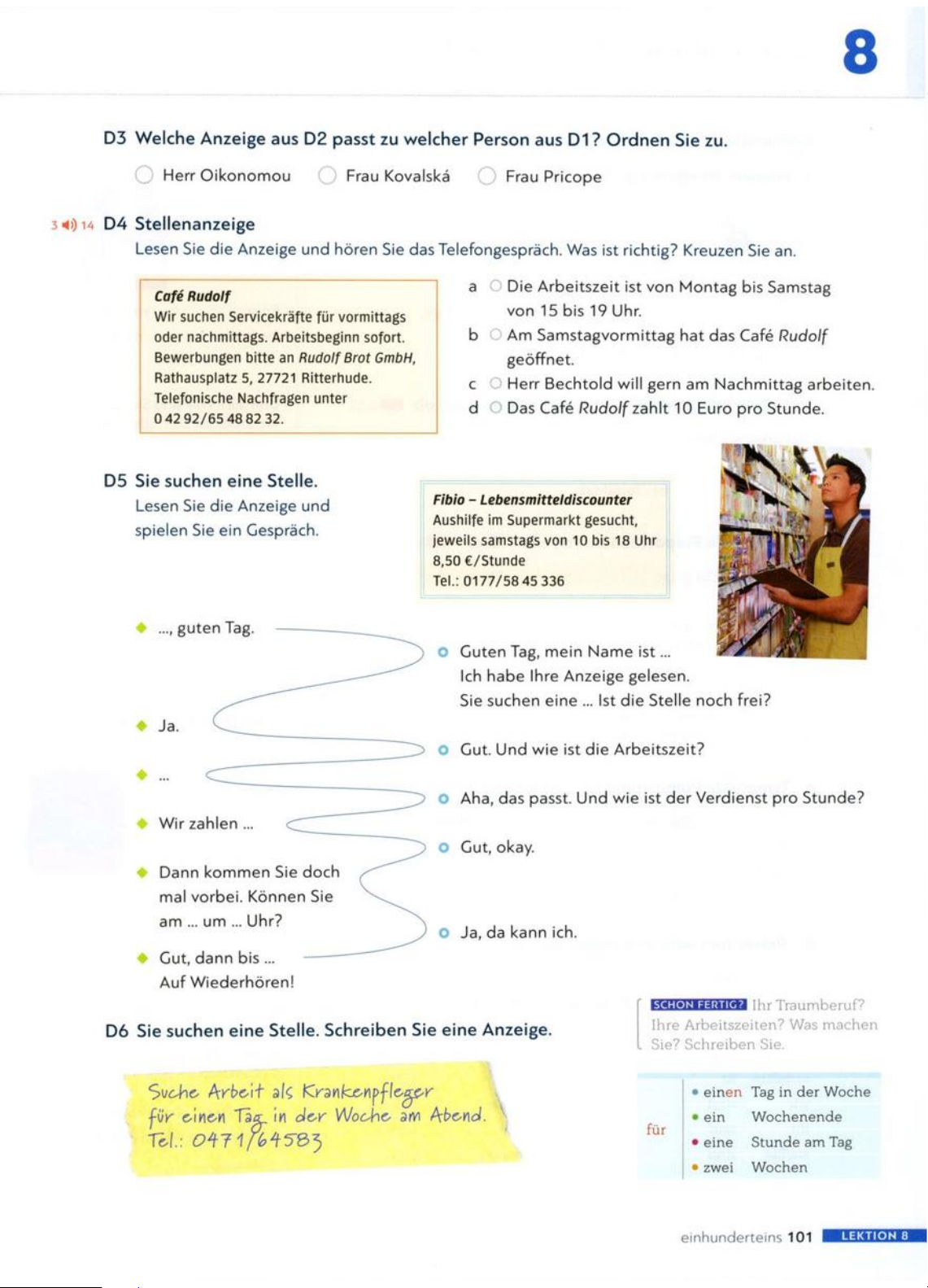 Lese n Sie d ie A n z e ig e un d h öre n Sie d as Te le fo n g esp räch. W as ist ric h tig ? Kre u z e n Sie an.