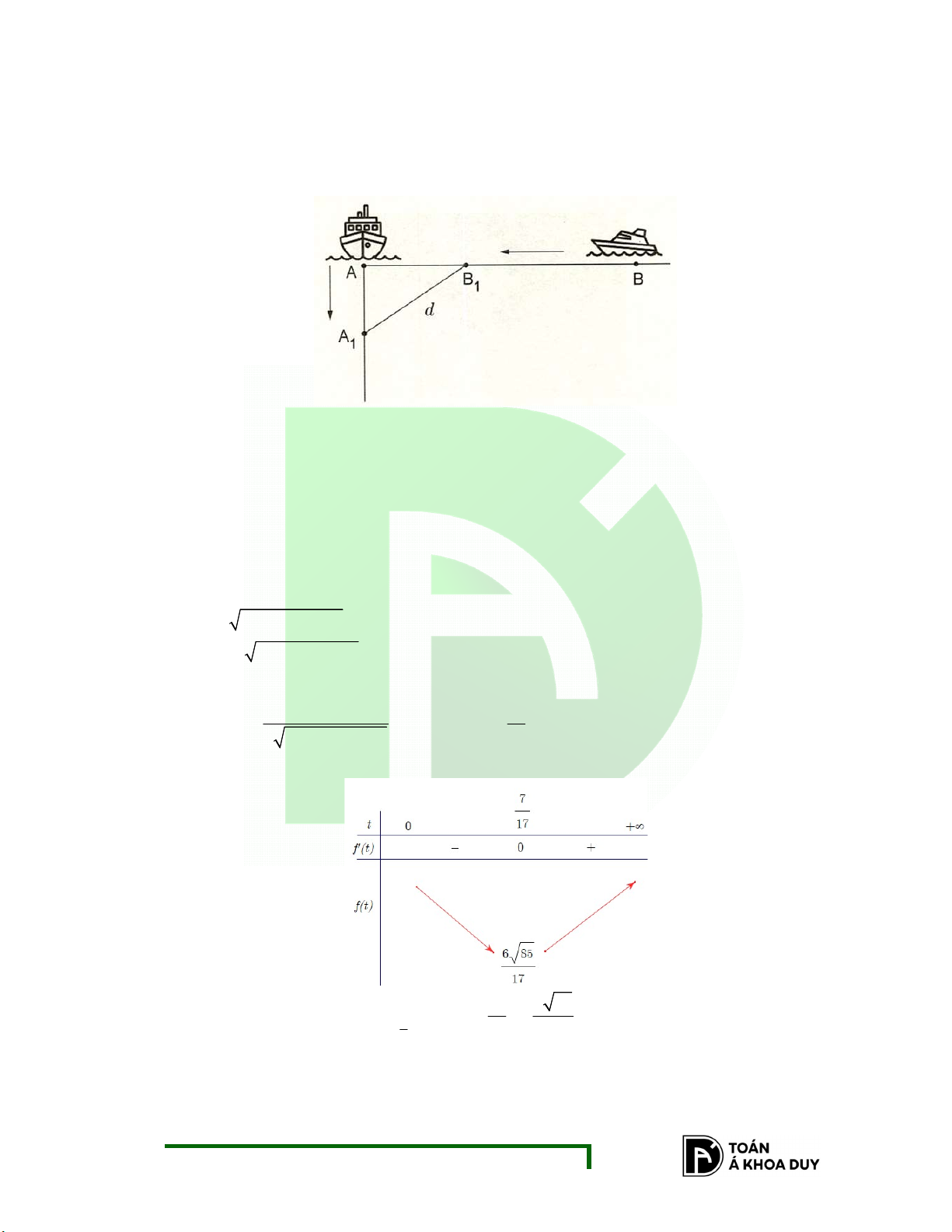 Bài toán trở thành tìm min f (t) . t ( 0;5) 170t 70 7 Ta có f (t) , f (t) 0 t (h). 2 2 85t 70t 25 17 Lập bảng biến thiên 7 6 85