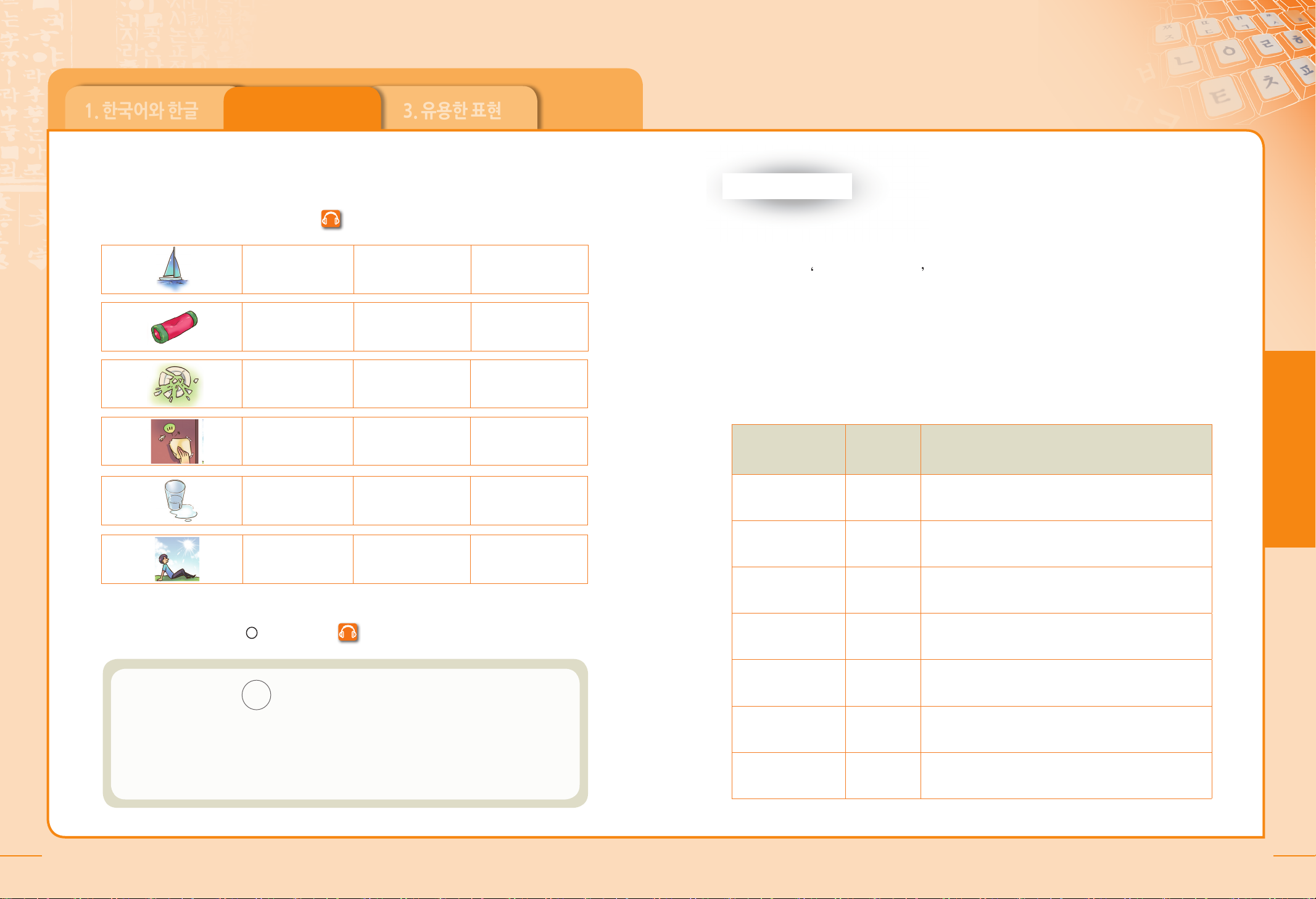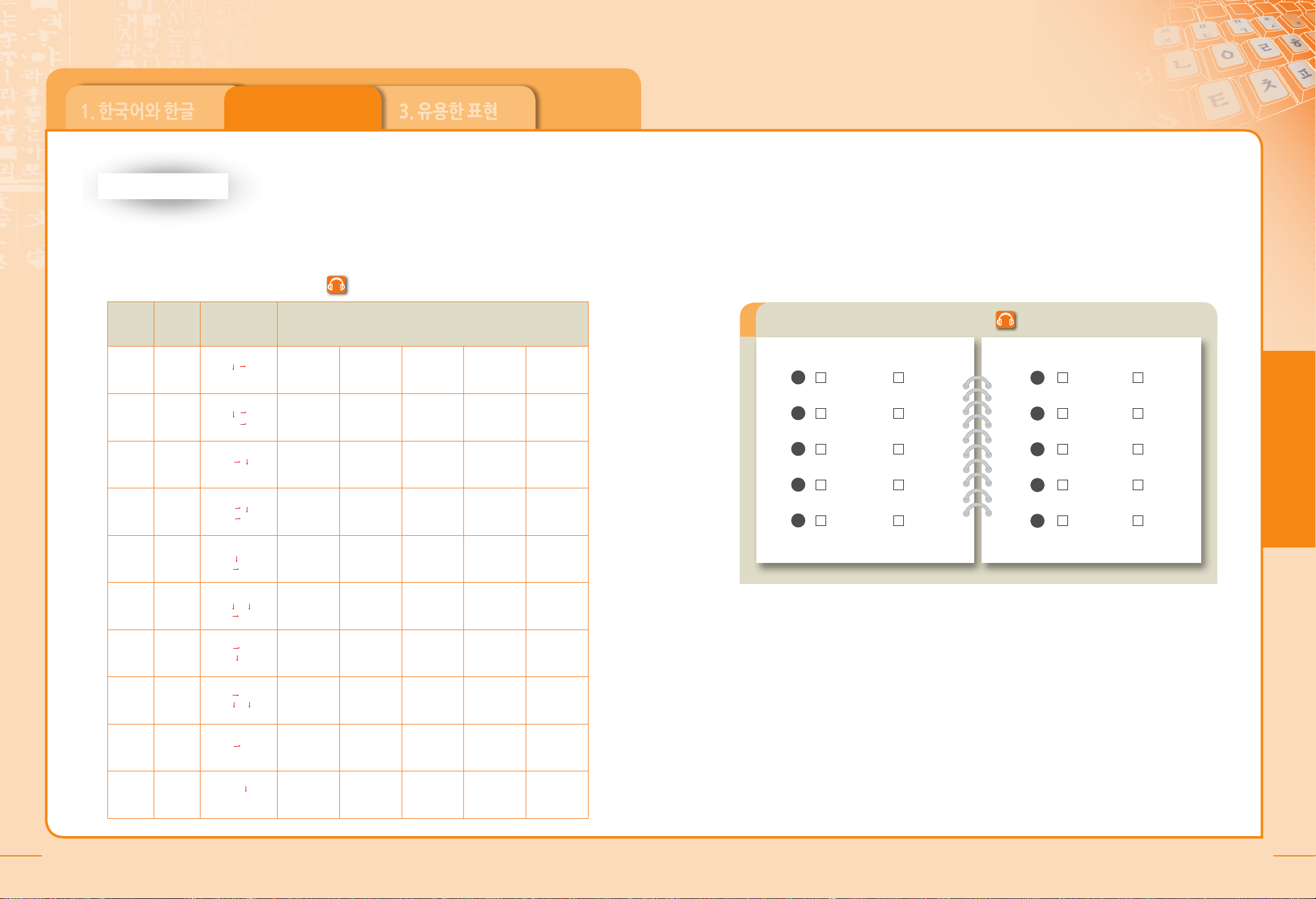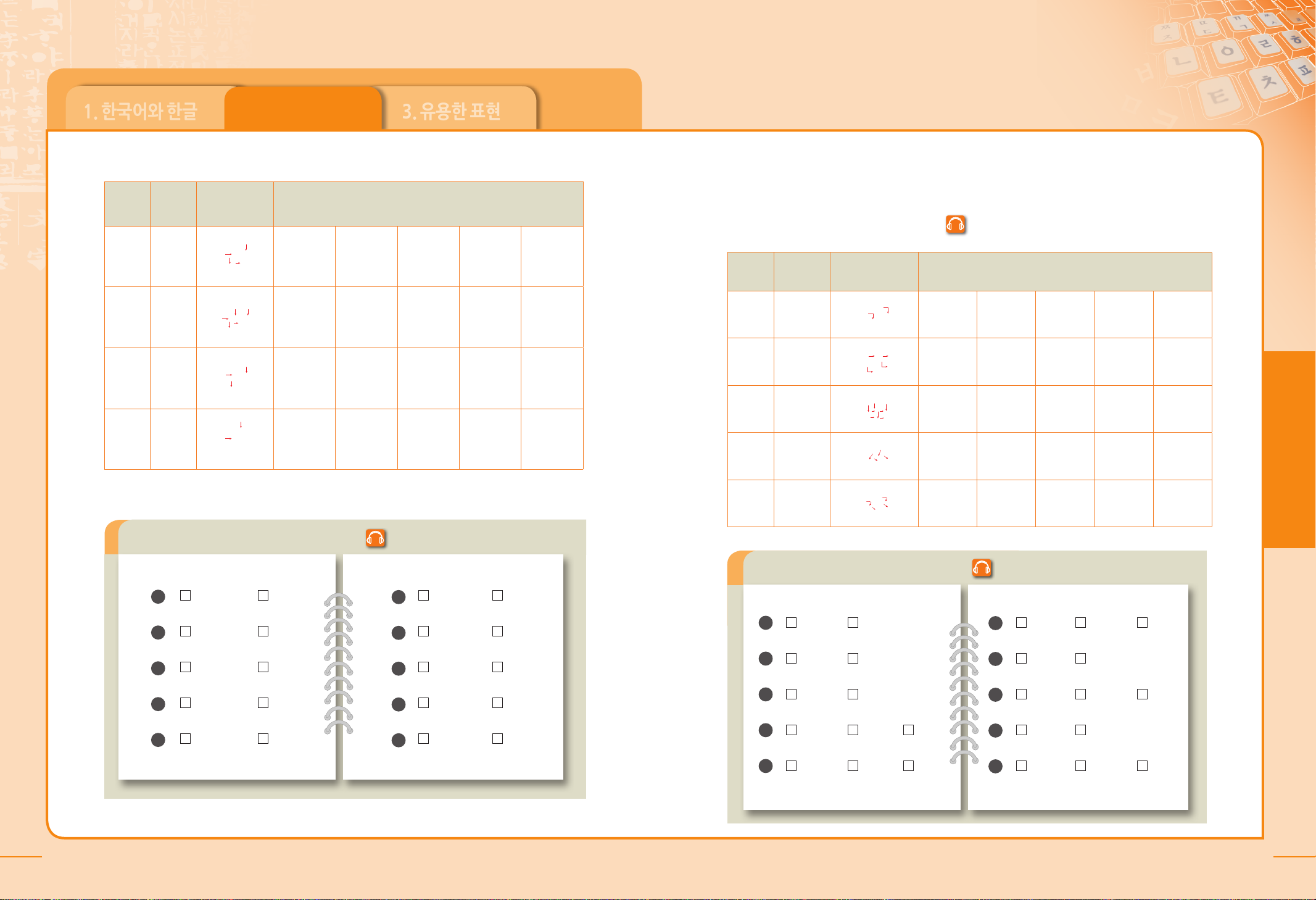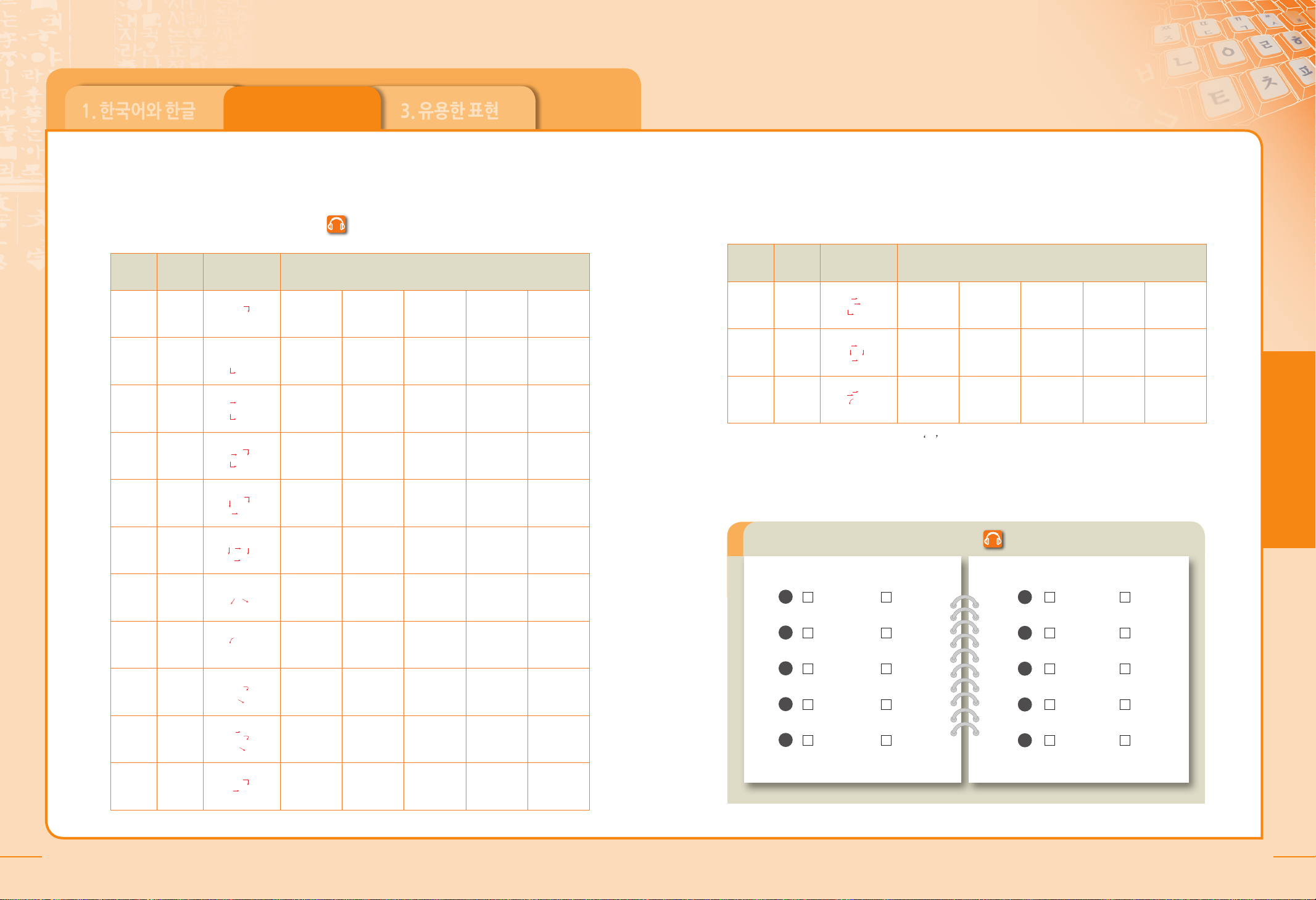 ② 잘 듣고 맞는 것을 고르세요. ① ③ ㅏ ① ① ③ 아 ㅏ ① ① ② ㅏ ① ③ ② ㅏ ① ② ① ③ ① ② ① ③ ① ② ① ③ ② ② ㅏ ② ① ① ① ② ㅐ ② ㅏ ㅐ ② ㄱ① ㅐ ㅏ ㄱ ㅐ 1 6 ② ㄱ① ㄲ ① ② ① ㅏ ㅓ ㅜ ㅡ ② ㄱ ㅏ ㅐ ① ㄲ② ① ㄲ ① ② ㅐ ② ㅐ ㄱ ㄲ ② ㄱ①① ㄲ ㅐ ㄱ ① ① ㄱ ② ㄲ ① ㅑ ① ② ① ③ ① ③ 야 ㅑ ① ② ① ① ② ① ① ④ ㅑ ① ③ 2 7 ① ① ㅗ ㅜ ㅏ ㅑ ① ② ① ④ ㅑ② ① ③ ② ① ① ① ④ ㅑ ① ② ① ③ ① ④ ㅑ ① ㅑ ④ ㅑ ① ④ ㅑ ㄴ ㄸ ③ ② ㄴ ④ 예 ① ㄸ ③ ② ㄴ ③ ② ④ ④ ① ㄸ ③ ② ㄴ ① ③ ② ㄴ ③ ② ④ ① ㄸ ③ ② ㄴ ③ ② ④ ① ㄸ ③ ② ㄴ ③ ㅑ ② ④ ① ② ㅒ ① ② ④ ③ ㅒ ① ② ③ ㅒ ① ② ③ ㅒ ② ① ② ③ ㅒ ② ③ ③ ① ①② ⑥ 3 ㅡ ㅣ 8 ㅓ ㅕ ㅓ ② ① ①② ① ⑥ ② 비 ① ② ⑥ 어 ㅓ ① ① ② ① ①② ⑥ ① ㅓ② ① ㅓ ① ② ① ② ①② ① ① ⑥ ② ①② ① ② ② ⑥ ① ① ① ⑥ ① ② ① ① ㅓ ③ ⑦ ㄷ ㅃ ③ ㄷ ㅓ ② ⑦ ③ ⑦ ㅓ ㄷ ㅃ ㅓ ㄷ ② ③ ② ⑤ ③ ⑧ ④ ⑦ ② ③ ⑦ ㅃ 편 ② ③ ㄷ ㅃ ② ③ ② ⑤ ⑧ ④ ③ ② ⑤ ③ ④ ② ㅃ ② ⑦ ㅃ ② ③ ② ⑤ ③ ⑧ ④ ③ ⑤ ④ ⑦ ㅃ ② ⑦ ③ ② ⑦ ② ③ ② ④⑤ ⑧ ④ ⑤ ⑧ ① ㅔ ② ③ ② ④⑤ ③ ④ ⑧ 4 ① ㅔ ㅗ ㅓ 9 ㅗ ㅛ ① ㅔ ② ③ ⑤ ① ㅔ ① ① ① ③ ㅔ ㅕ ① ③ ① ③ ① ① ② ① ③ ① ㅔ ① ③ 여 ㅕ ① ③ ② ① ③ ① ① ③ ② ① ㅕ ① ② ① ㅕ ① ③ ① ㅕ ① ③ ① ① ③ ② ① ③ ① ㅕ ③ ② ① ③ ② ① ㅕ ① ㅕ ㄹ ㅆ ② ① ㅕ ㄹ ④ 5 ㅓ ㅜ 1 0 ㅜ ㅠ ③ ㅆ ② ㄹ ② ② ㄹ ㅆ ② ㄹ ③ ② ㄹ ② ② ㅆ ② ㅕ ③ ② ④ ③ ② ④ ③ ② ③ ② ④ ② ③ ② ④ ③ ② ④ ② ② ④ ③ ④ ③ ③ ①③ ④ ③ ④ ① ① ① ③ ① ③ ④ ① ①③ ① ④ ① ①③ ④ ① ㅖ ① ③ ① ㅗ ② ① ① ② ① ① ① ① ① ③ ① ㅖ ③ 오 ㅗ ② ② ① ① ② ㅗ ① ㅖ ② ② ① ② ㅁ ① ① ② ① ③ ④ ㅗ ㅖ ② ① ② ㅁ② ㅗ ㅁ② ㅉ ① ① ④ ㅗ ㅖ ㅁ ① ④ ② ㅗ ㅁ ④ ㅉ ② ㅁ②② ㅁ③ ② ④ ㅉ ③ ③ ② ㅁ ㅉ ③ ② ㅁ③③ ② ② ② ② ㅗ ③ ② ③ ② ② ② ③ ② ② ② ② ② ① ② ① ① ② ③ ① ③ ② ③ ① ③ ② ① ② ③ ① ② ③ ② ③ ① ③ ㅛ ㅛ ① ㅛ ① ㅛ ① ② ㅛ ③ ① ② ① ② ① ㅛ② ㅛ ③ ① ③ ① ② ③ ① ② ① ㅛ ③ ① ③ ① ① ㅛ ㅂ ① ③② ③ ④ ㅂ ③ ④ ③ ④ ③ ㅂ 요 ③ㅛ ㅂ ③ ④ ㅘ ② ③ ④ ③ ③ ㅛ ④ ④ ㅘ ② ④ ㅘ ② ④ ㅘ ② ④ ④ ㅘ ② ④ ㅘ ② ④ ② ① ① ① ① ㅜ ㅜ ① ① ① ① ③ ⑤ ㅜ ① ① ③ ① ⑤ ㅜ ③ ① ③ ⑤ ㅅ 우 ② ㅅ ㅜ ① ㅜ ③ ㅜ ① ③ ⑤ ③ ② ② ② ⑤ ㅅ ③ ⑤ ② ㅜ ② ① ㅅ ② ② ① ㅅ ② ② ② ② ㅜ ① ① ① ② ① ② ④ ② ② ㅙ ②① ④ ㅙ ②① ② ④ ㅙ ㅠ ② ④ ㅙ ① ② ④ ① ㅙ ① ② ④ ① ① ② ① ㅠ ㅠ ① ① ① ① ① ㅇ ㅠ ㅇ ㅠ ① ㅇ ② ③ ② ③ ② ② ③ ㅇ ② ③ 유 ② ③ ② ③ ② ③ ② ③ ㅠ ③ ① ③ ① ③ ① ③ ㅡ ① ③ ① ③ ① ① ㅚ ① ① ① ㅚ ① ㅚ ① ① ① ② ① ② ② ① ㅚ ② ① ① ㅚ ① ① ㅡ ㅡ ① ① ② ② ② ㅈ ㅡ 으 ㅡ ② ㅈ②② ㅈ②② ④ ② ④ ① ④ ① ① ① ① ① ① ① ① ④ ① ④ ① ① ① ④ ① ② ① ① ㅝ ① ① ① ① ㅊ② ㅝ ① ① ㅊ② ㅝ ㅊ② ㅣ ㅝ ㅊ ② ③ ② ㅊ ② ③ ② ② ③ ㅊ ② ③ ② ③ ㅊ ㅣ ㅣ ② 이 ㅣ ㅣ ㅣ ② ③ ③ ② ③ ③ ② ③ ③ ② ③ ③ ② ③ ③ ③ ④ ⑤ ④ ⑤ ② ① ④ ⑤ ④ ⑤ ㅋ ② ① ④ ⑤ ㅋ ② ④ ⑤ ② ① ㅋ ① ② ① ② ① ㅋ ①ㅞ ② ① ② ① ① ㅋ ①ㅞ ① 18 ....세종한국어 1 ① ②③ ㅞ ②③ ㅞ ② 세종한국어 1 ②③ ㅞ ....19 ②③ ②③ ②③ ③ ② ① ② ① ② ① ② ① ② ① ② ① ㅌ ① ② ② ③ ㅌ ③ ③ ㅌ ③ ③ ② ㅌ ③ ③ ㅟ ③ ①ㅟ ③ ①ㅟ③ ①ㅟ ③ ① ③ ③ ① ① ① ② ㅟ ① ② ① ㅟ ② ② ② ① ③ ② ② ㅍ ② ① ③ ㅍ ④ ② ① ② ① ③ ㅍ ② ④ ② ③ ㅍ ② ② ③ ㅍ ② ④ ② ③ ㅍ ② ④ ② ④ ② ④ ② ② ① ① ① ② ㅢ ① ① ①ㅢ ①ㅢ ① ㅎ ① ② ㅢ ① ② ②① ③ ②③ㅎ ② ②③ ㅎ ③ ③ ③ ① ③ ㅏ ① ① ① ③ ② ② ② ① ① ② ① ① ② ㅏ ㅐ ② ㅐ ㄱ① ㄱ ㄲ② ㄲ ㅑ ① ① ② ① ③ ② ② ① ③ ① ④ ㅑ ① ④ ㄴ ㄸ ③ ② ㄴ ③ ② ④ ① ㄸ ③ ② ① ② ㅒ ④ ① ② ③ ㅒ ③ ㅓ② ① ①② ① ⑥ ② ① ① ① ⑥ ① ② ① ③ ⑦ ㅓ ㄷ ㅃ ③ ⑦ ㅃ ② ② ③ ② ⑤ ⑧ ④⑤ ④ ② ③ ⑤ ⑧ ④ ① ㅔ ① ① ㅕ ① ③ ① ③ ① ③ ① ③ ② ① ② ① ③ ② ① ㅕ ① ㄹ ㅆ ② ㄹ ② ③ ② ② ④ ② ③ ② ④ ③ ④ ①③ ④ ① ㅗ ① ① ① ③ ① ① ① ③ ② ① ㅖ ② ② ㅗ ㅁ ① ② ④ ㅁ ④ ㅉ ③ ② ㅁ③ ② ② ② ② ㅛ ① ② ① ② ③ ① ③ ③ ① ③ ② ① ㅛ ② ① ㅂ ③ ④ ③ ④ ③ ④ ㅘ ② ④ ㅘ ② ㅜ ① ① ① ㅜ ① ③ ⑤ ㅜ ③ ⑤ ② ㅅ ② ② ② ① ㅅ ② ① ① ④ ㅙ ② ④ ㅙ 1. 한국어와 한글 2. 한글 자모 3. 유용한 표현 ② ② ㅠ ① ① ㅠ ① ① ㅇ ① ㅇ ② ③ ② ② ③ ③ ① ③ ① ㅡ ① ① ㅚ ① ① ② ㅡ ② ㅈ② (2) 자음 1 ② ④ ④ ① ① ① ① ① ① ② ㅝ ㅣ ㅊ② ㅊ ② ③
