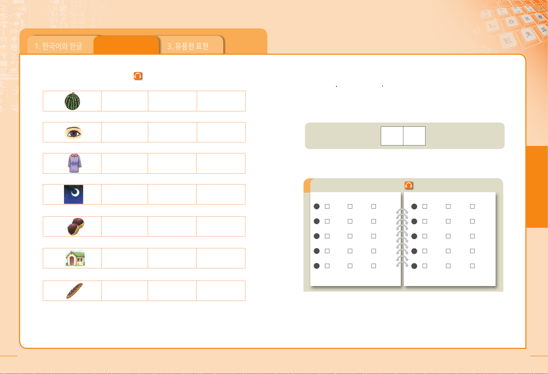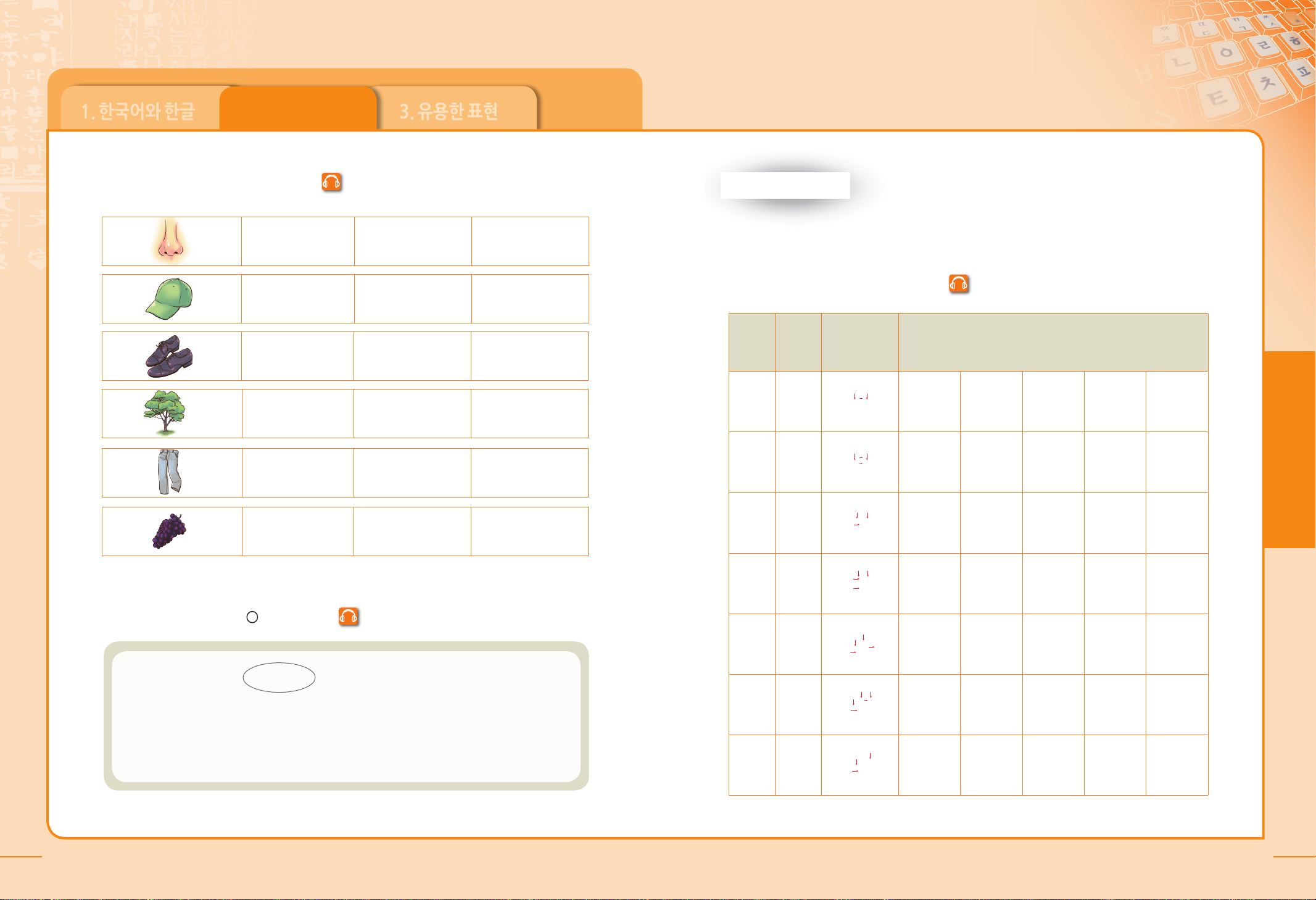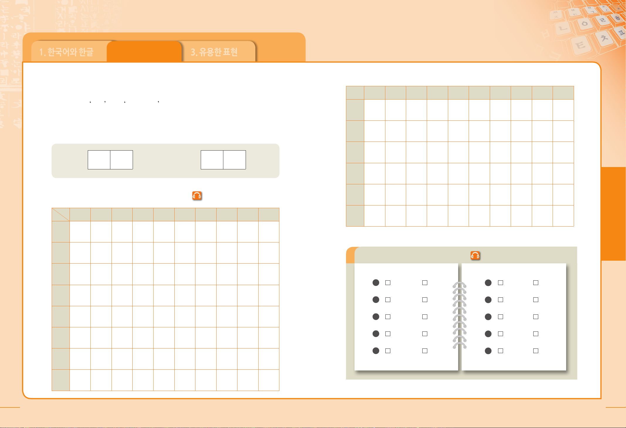 ② 잘 듣고 맞는 것을 고르세요. 비읍 ④ ④ ④ ㅂ ㅘ ② ② ④ ㅘ ② ④ ㅘ ② ④ ㅘ ② ㅜ ① ① ① ㅜ ① ① ① ① ① ③ ⑤ ㅜ ① ③ ㅜ ① ③ ⑤ ① ② ㅜ ③ ⑤ ① ㅜ ③ ⑤ ㅜ 1 6 ③ ⑤ ③ ⑤ ㅅ②② ㅜ ③ ⑤ ② ㅅ② ㅅ ② ① ② ② ① ② ㅅ ② ② ② ㅅ ② ① ② ① ① ㅅ 시옷 ㅅ 가 바 사 자 ① ① ④ ㅙ ② ④ ㅙ ② ④ ㅙ ② ④ ㅙ ㅠ ② ④ ㅙ ① ② ② ① ① ② ① ① ① ① ① 2 ① ① 7 ① ① ① 나 마 아 하 ㅠ ㅠ ①ㅠ ① ㅇ ② ③ ② ② ③ ② ㅇ ② ③ ② ③ ② ㅇ ② ③ ② ③ ㅇ 이응 ㅇ ① ③ ① ① ③ ① ③ ① ③ ① ① ① 3 ① 8 ① ① ① ① ㅚ ① ① ㅚ ① ① ㅚ ① ② 나 다 자 차 ㅡ ① ② ㅡ ② ㅡ ② ㅡ ② ㅡ ② ㅡ ㅈ ㅈ 지읒 ② ㅈ② ㅈ② ㅈ② ㅈ ② 4 라 마 9 카 타 ④ ① ④ ④ ④ ① ① ④ ㅣ①① ① ④ ① ① ㅝ ① ① ①ㅝ ① ①ㅝ ① ① ① ① ① ㅊ② ㅝ ㅊ② ㅣ ㅊ 5 10 ② ③ ㅊ② ② ③ ㅊ ② ③ ㅣ ② ② ③ ㅊ ② ③ ② ② ③ ㅊ ② ③ ② ② ③ ㅊ② ② ③ ㅣ ② ③ ㅣ ㅣ ② ③ ㅊ 치읓 ③ ③ ③ ③ ㅣ ③ ㅊ 바 파 가 카 ③ ④ ⑤ ④ ⑤ ④ ⑤ ④ ⑤ ④ ⑤ ㅋ ② ① ⑤ ㅋ ② ① ㅋ ② ② ① ㅋ ① ② ① ㅋ ① ① ㅋ ① ② ① ① ㅞ ① ③ ㅋ ② 키읔 ㅋ ㅞ ②③ ㅞ ②③ ㅞ ②③ ②③ ② ②③ ② ① ① ① ② ① ② ① ② ② ② ㅌ ③ ③ ㅌ ③ ③ ㅌ ③ ③ ㅟ ③ ③ ①ㅟ ① ③ ①ㅟ ① ③ ①ㅟ ① ① ① ② 20 ....세종한국어 1 세종한국어 1....21 ② ① ㅟ ② ① ㅟ ② ② ② ② ① ② ① ① ③ ㅍ ① ② ③ ㅍ ④ ② ③ ㅍ ④ ② ③ ㅍ ② ② ③ ㅍ ② ④ ② ④ ② ④ ② ② ④ ② ① ① ① ① ② ㅢ ① ①ㅢ ① ①ㅢ ① ㅎ ① ②① ② ② ① ②① ②③ ②ㅎ ②③ ③ ㅎ ③ ③ 1. 한국어와 한글 2. 한글 자모 3. 유용한 표현 (3) 음절 1 ㅏ ㅑ ㅓ ㅕ ㅗ ㅛ ㅜ ㅠ ㅡ ㅣ