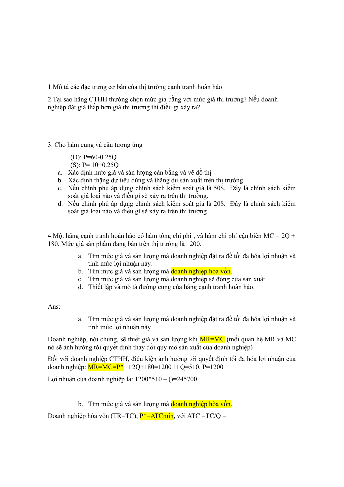 1.Mô tả các đặc trưng cơ bản của thị trường cạnh tranh hoàn hảo