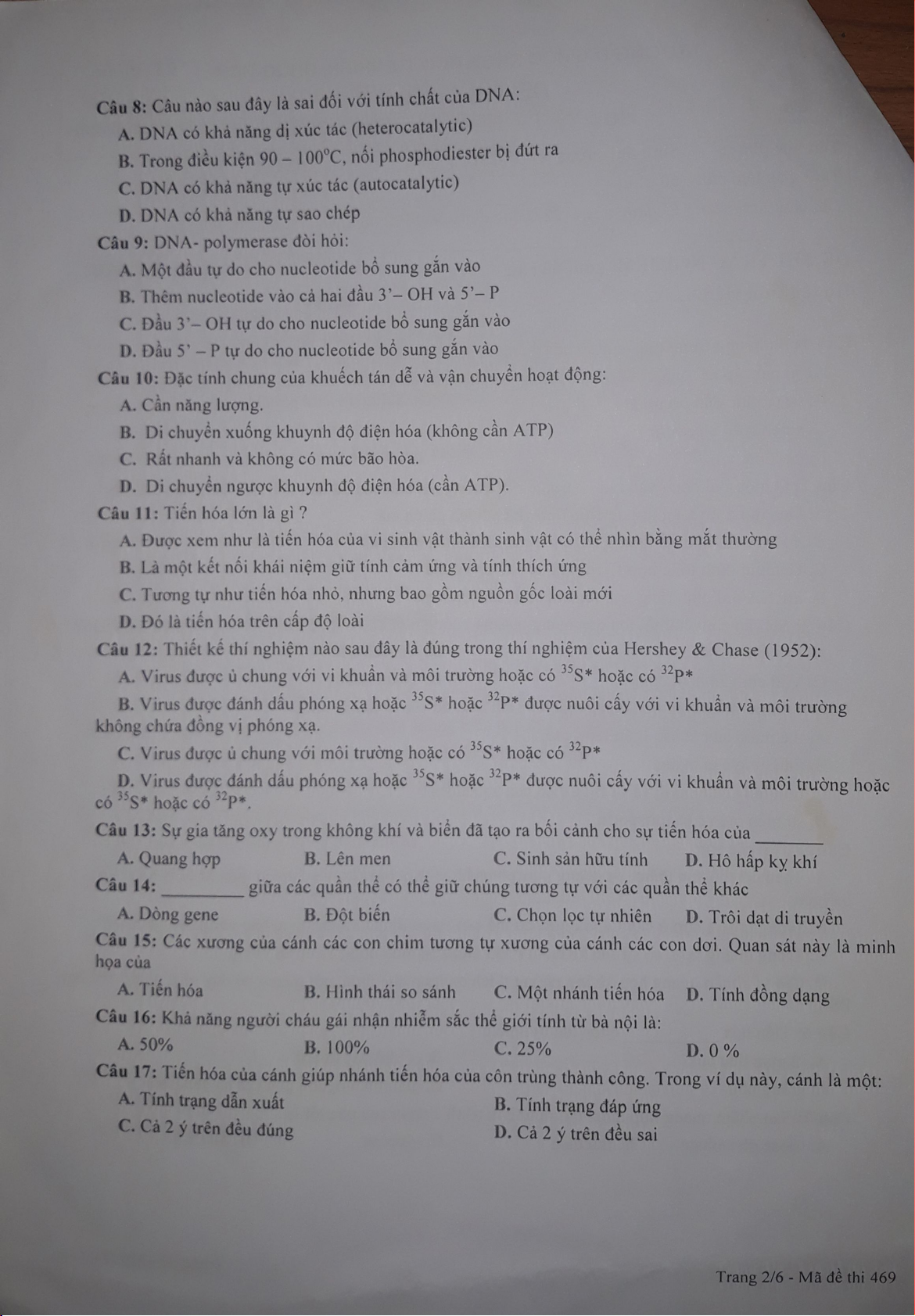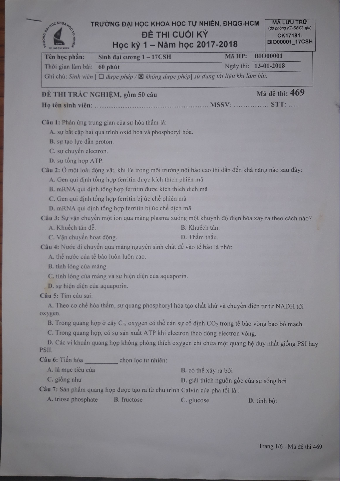 Đề thi cuối học kỳ 1 năm học 2017-2018 môn Sinh học đại cương 1 | Trường Đại học Khoa học tự nhiên, Đại học Quốc gia Thành phố Hồ Chí Minh