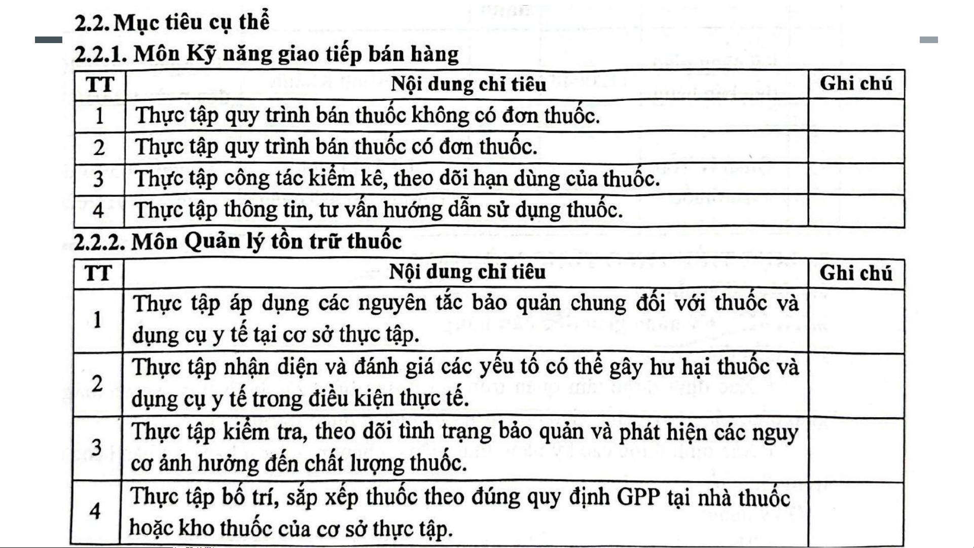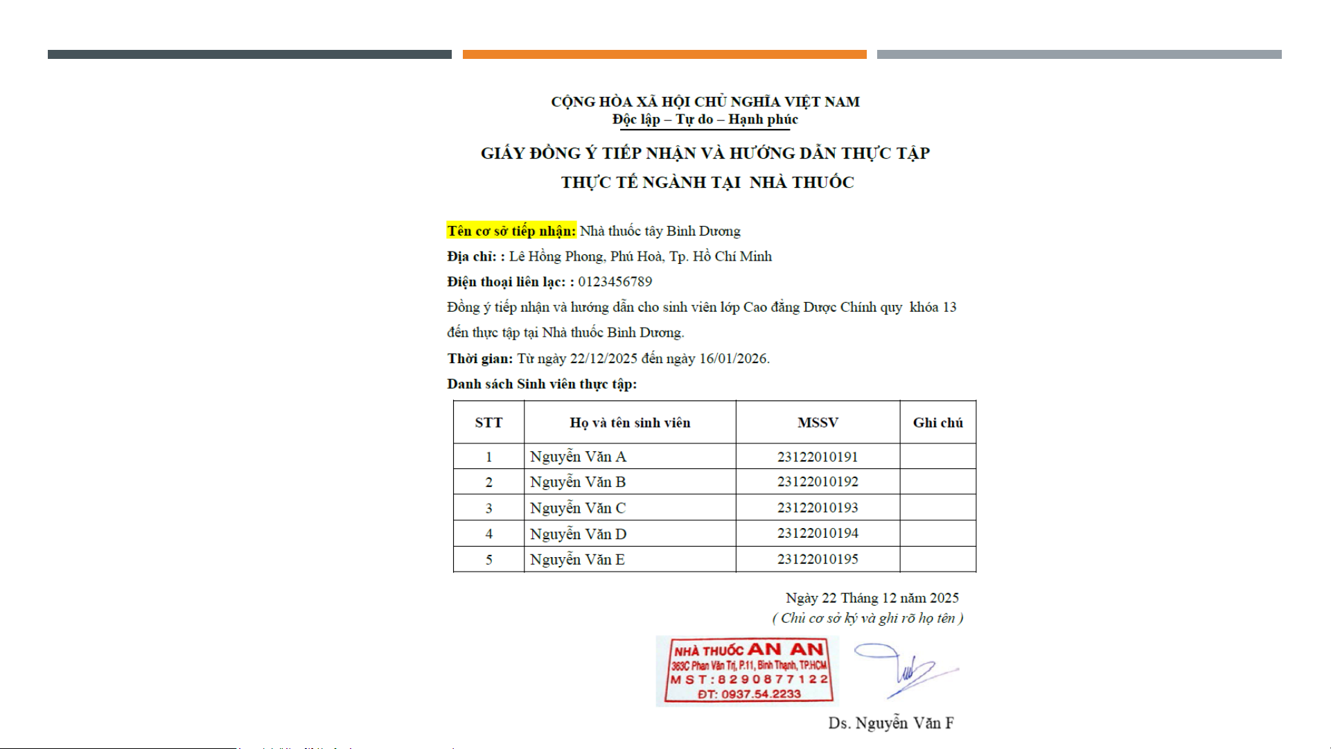 1 Giấy tiếp nhận sinh viên thực tập / 2 môn học/ 1 nhà thuốc