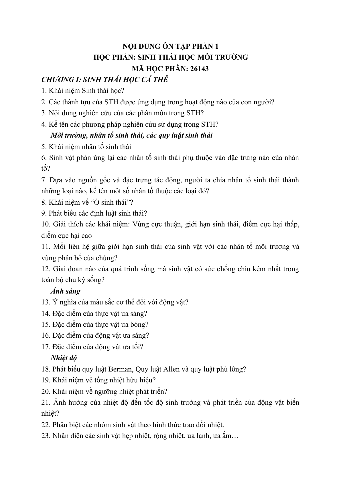 HỌC PHẦN: SINH THÁI HỌC MÔI TRƯỜNG MÃ HỌC PHẦN: 26143