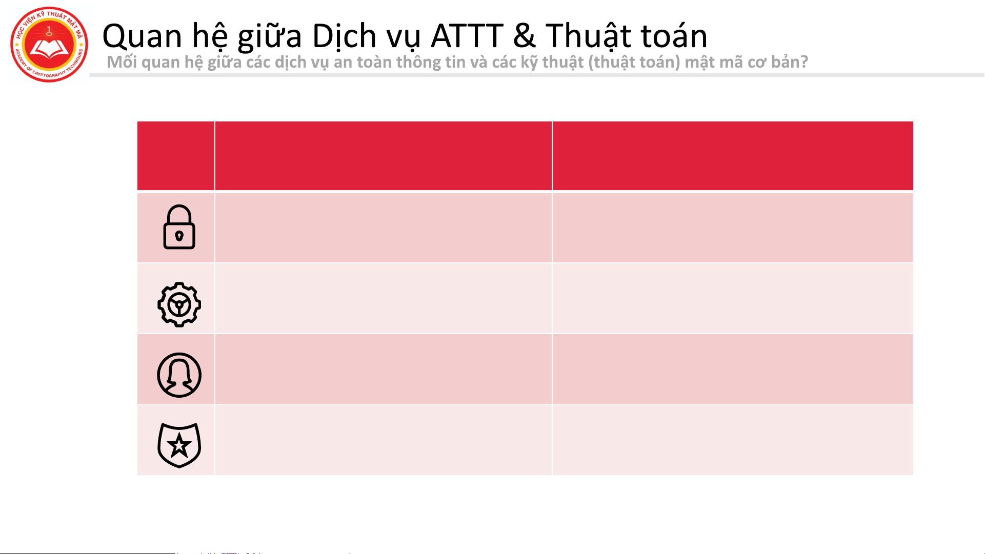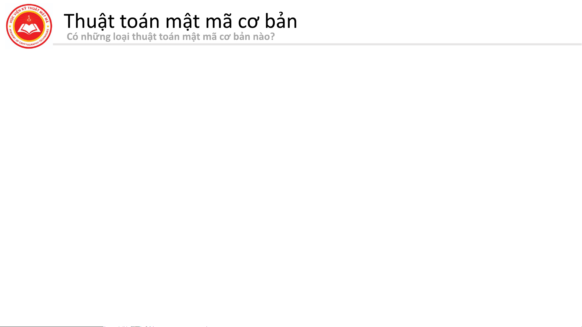 Mật mã đối xứng/ Mật mã khóa bí mật Mã khối Hàm băm không khóa Hàm băm Hàm băm có khóa Mật mã bất đối xứng/Mật mã khóa công khai Chữ kí số Thuật toán mật mã Sinh số ngẫu nhiên