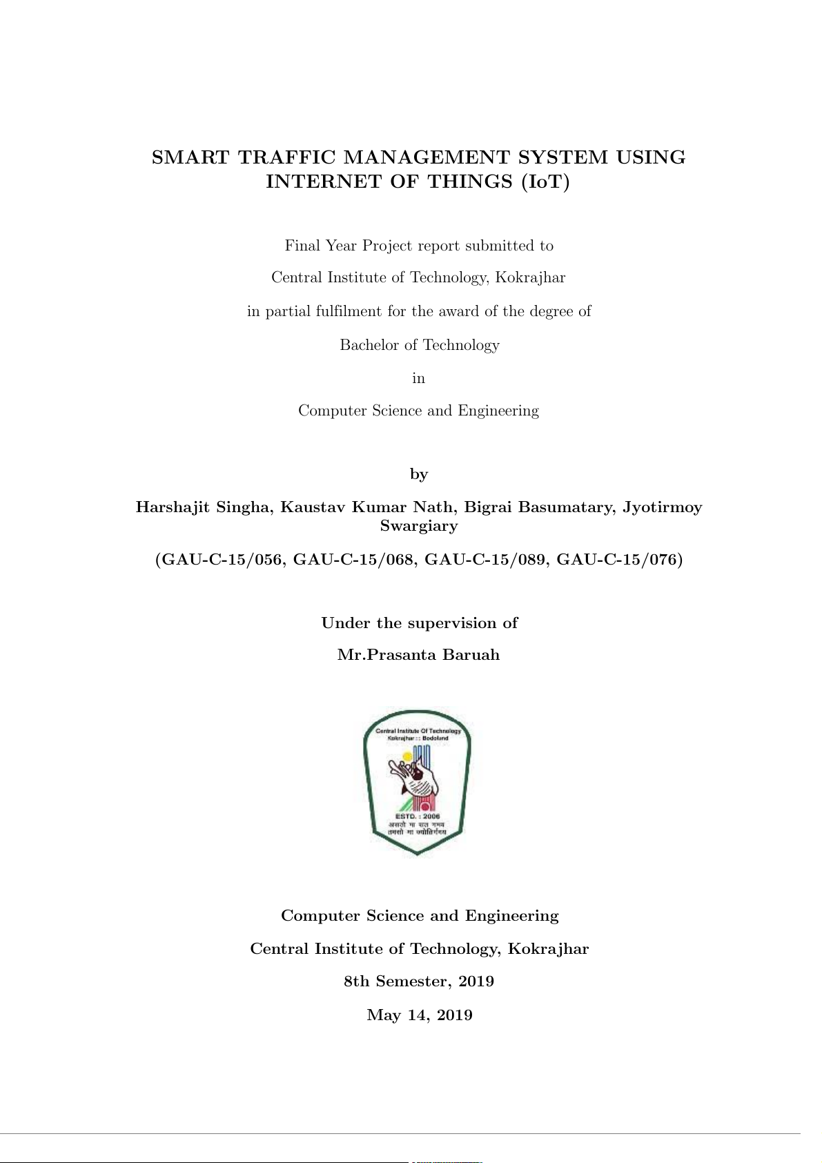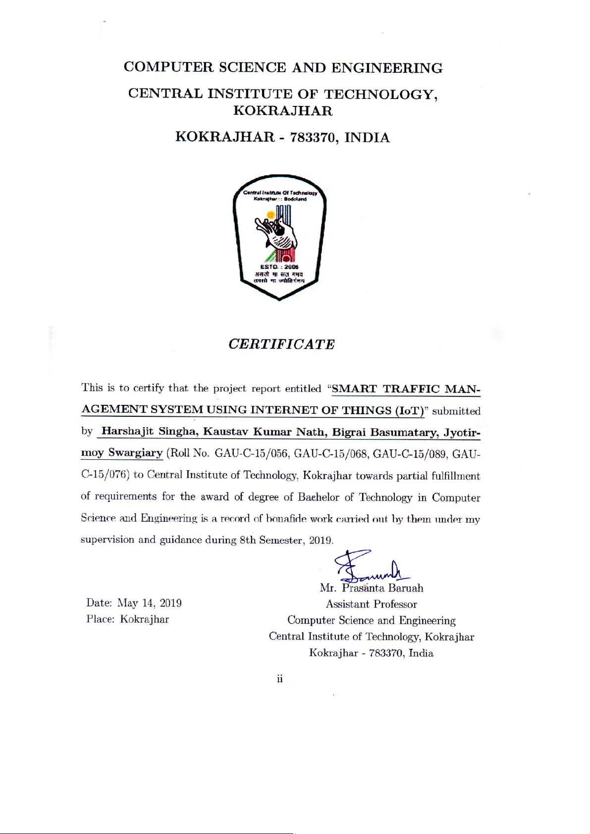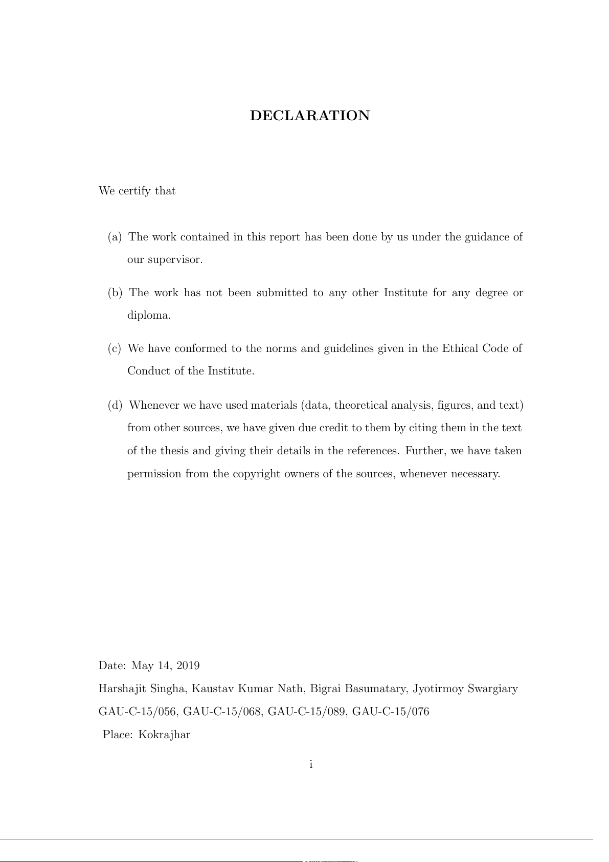Central Institute of Technology, Kokrajhar 8th Semester, 2019 May 14, 2019 DECLARATION We certify that
