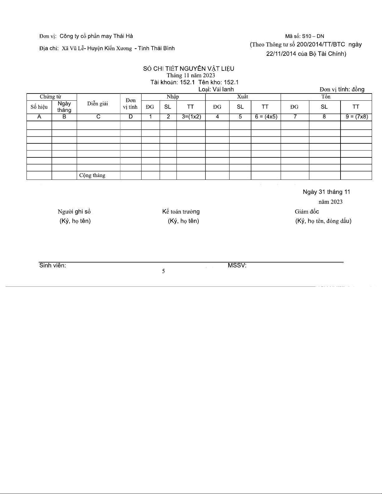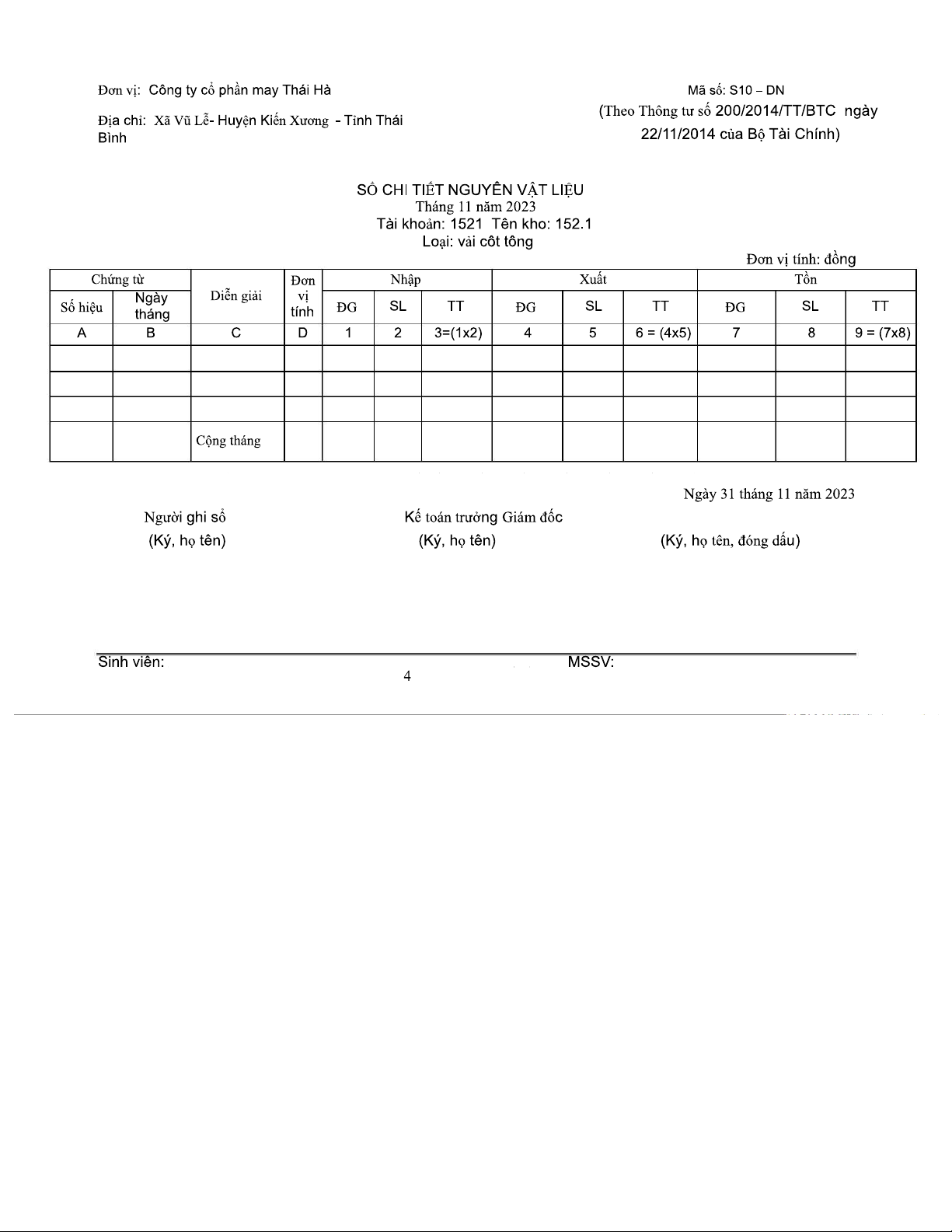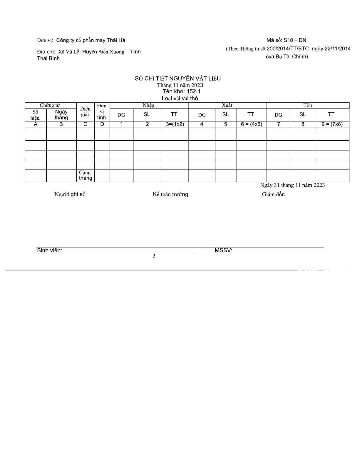 Sổ Chi Tiết Nguyên Vật Liệu Tháng 11/2023 - Mã Số S10-DN