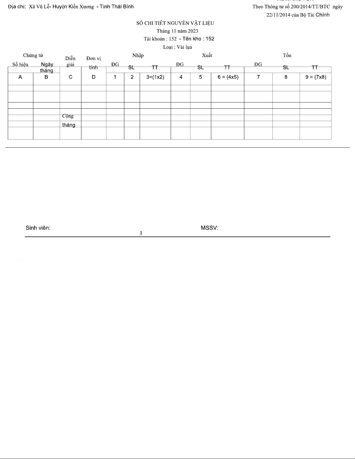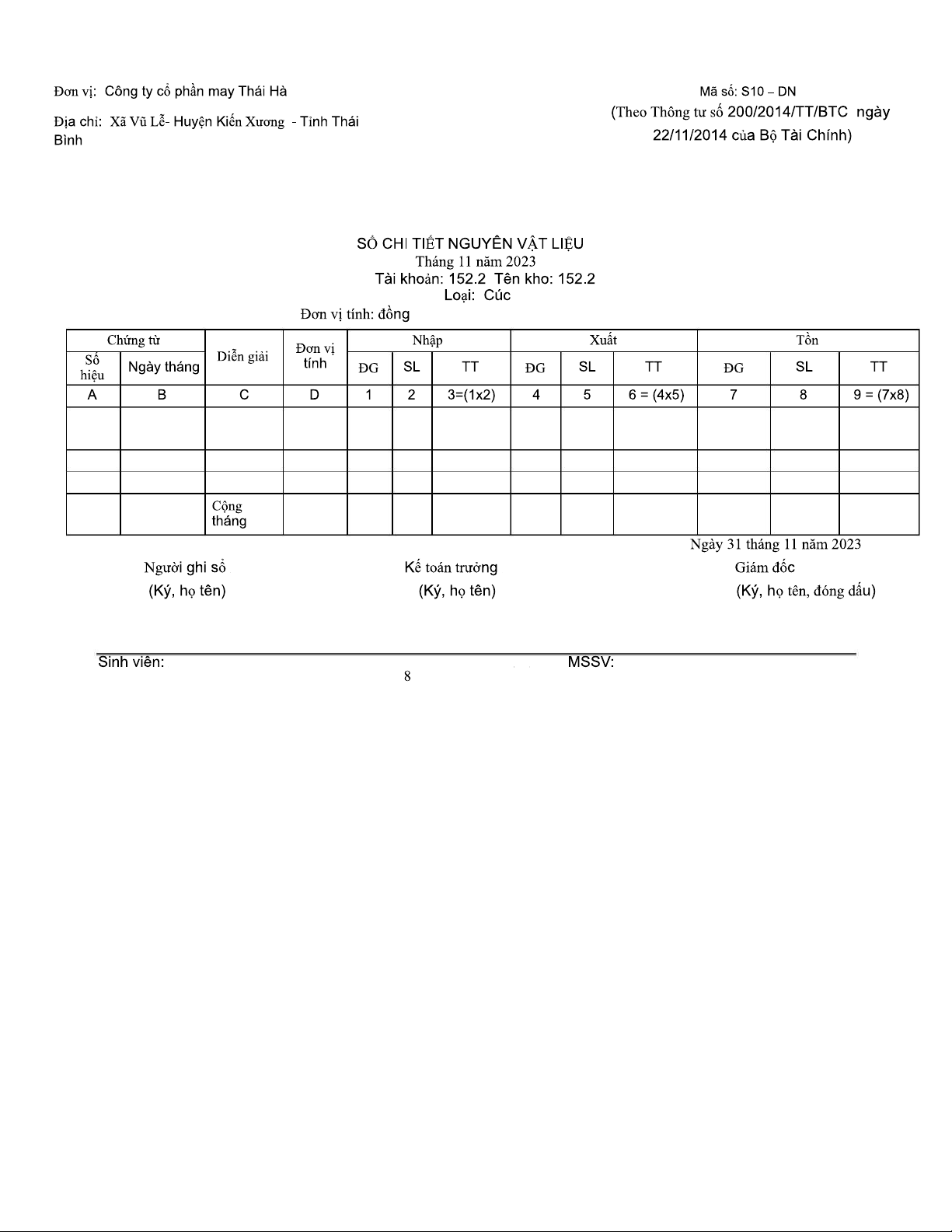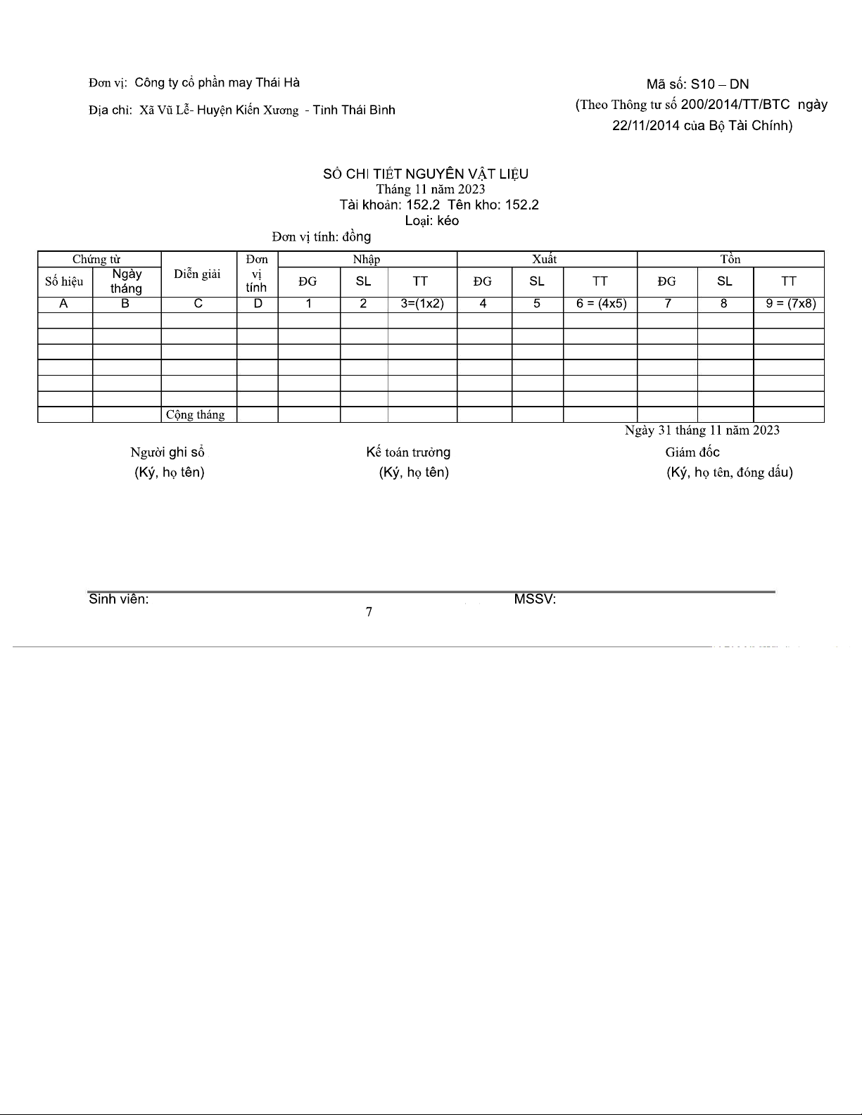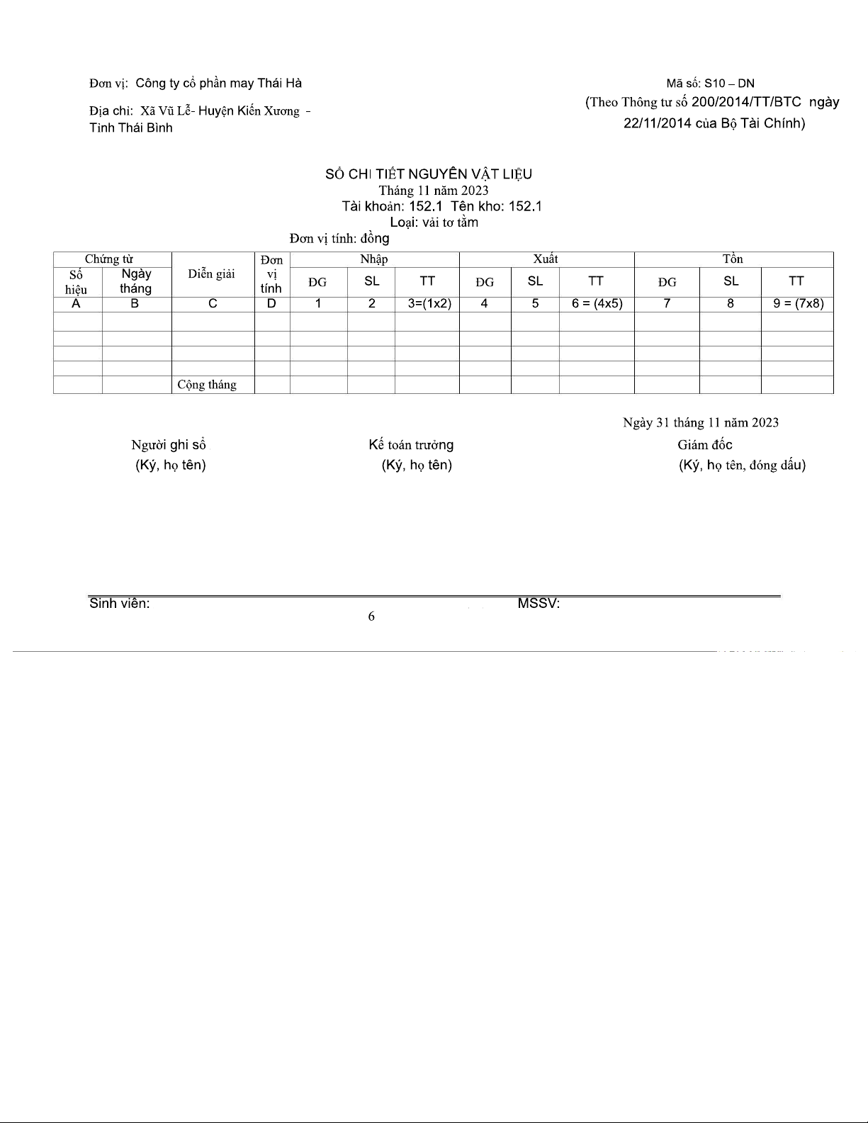 Sổ Chi Tiết Nguyên Vật Liệu Tháng 11/2023 - Mã Số S10-DN