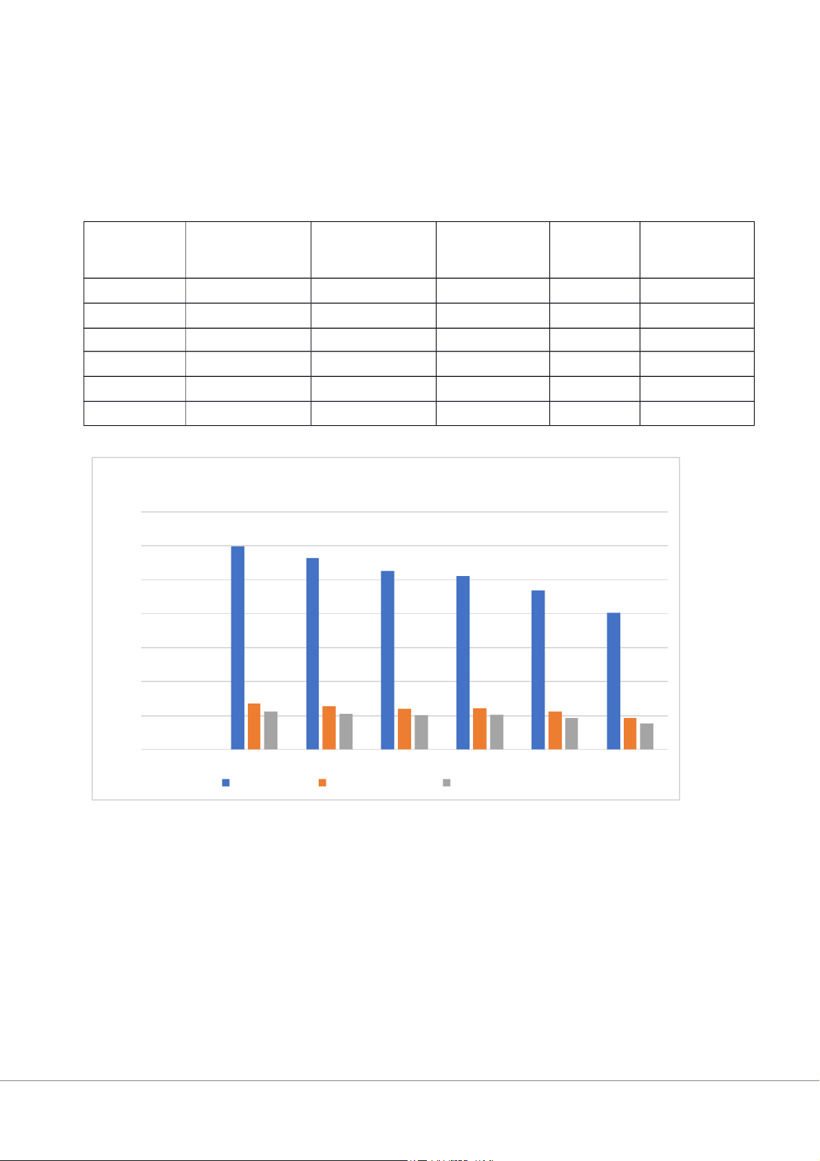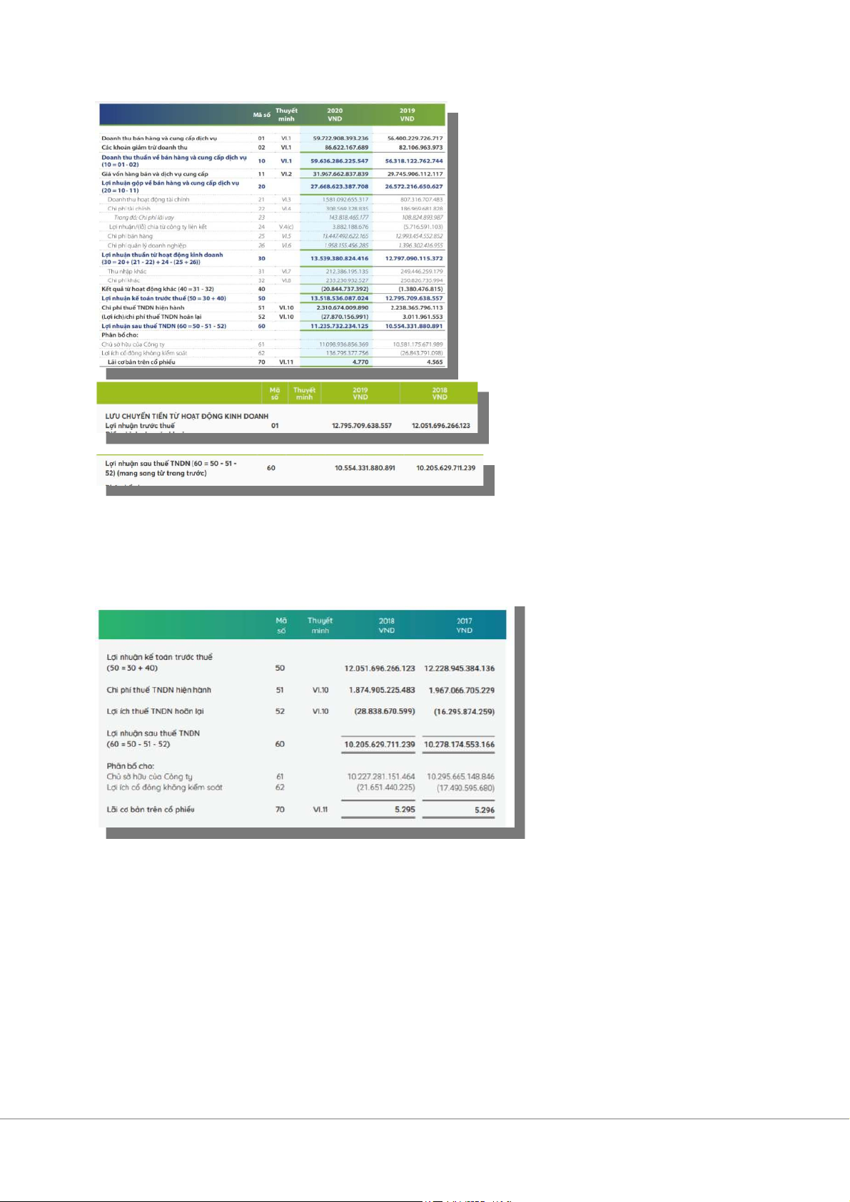 Số liệu gồm: tổng doanh thu, lợi nhuận trước thuế và sau thuế. Đơn vị: tỉ VNĐ. Loại Tổng doanh thu Lợi nhuận trước Lợi nhuận sau Thuế phải Phần trăm Năm thuế thuế đóng thuế(%) 2020 59,723 13,519 11,236 2,283 16.8873 2019 56,400 12,796 10,554 2,242 17.5211 2018 52,629 12,052 10,206 1,846 15.3170 2017 51,135 12,229 10,278 1,951 15.9539 2016 46,965 11,238 9,364 1,874 16.6756 2015 40,223 9,367 7,770 1,597 17.0492 Chart Title 70,000 60,000 50,000 40,000 30,000 20,000 10,000 0 Năm 2020 2019 2018 2017 2016 2015 Tổng doanh thu Lợi nhuận trước thuế Lợi nhuận sau thuế