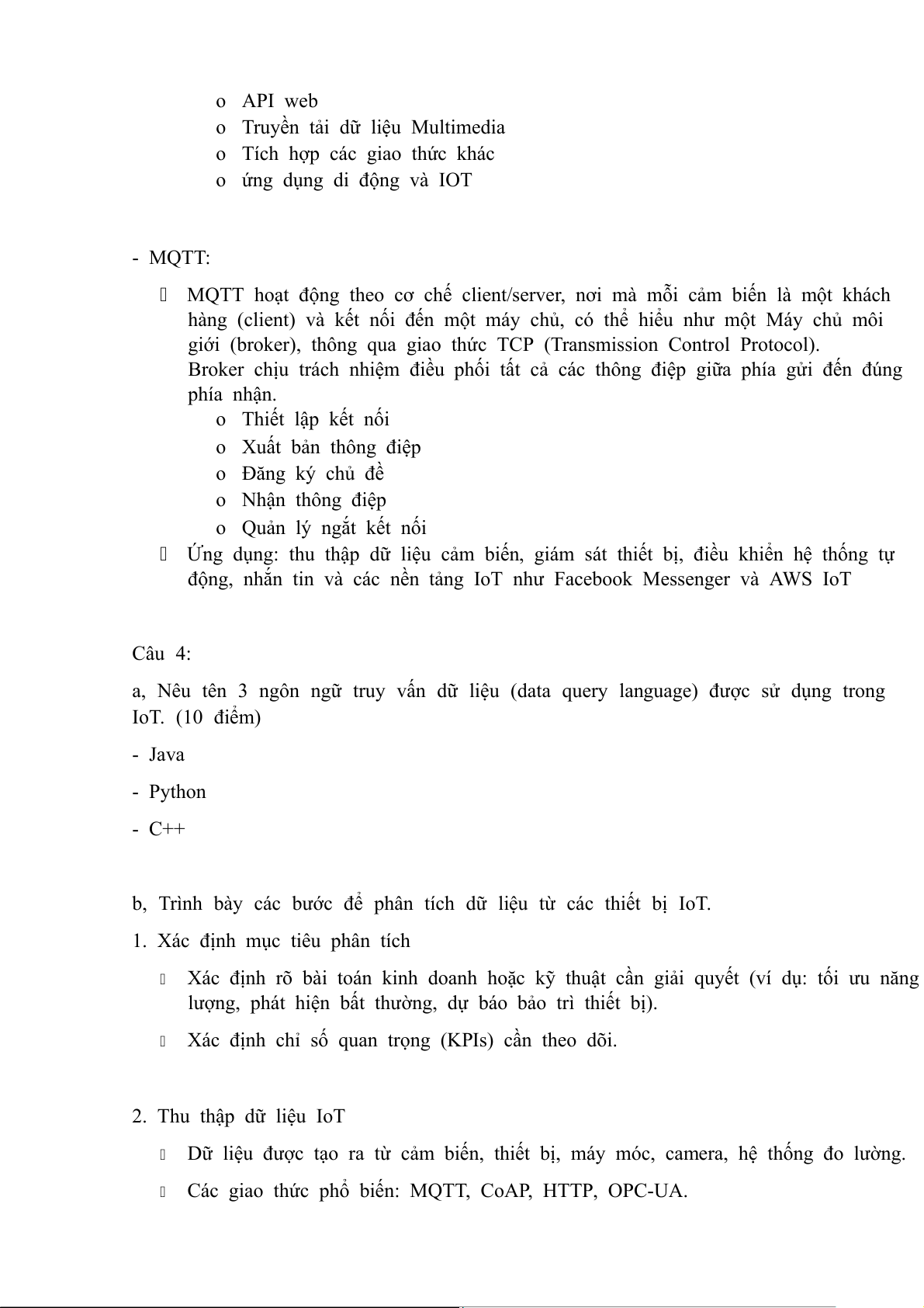 a) Mô tả các giao thức truyền thông được sử dụng trong IoT (ví dụ: MQTT, CoAP, HTTP). - Giao thức MQTT: