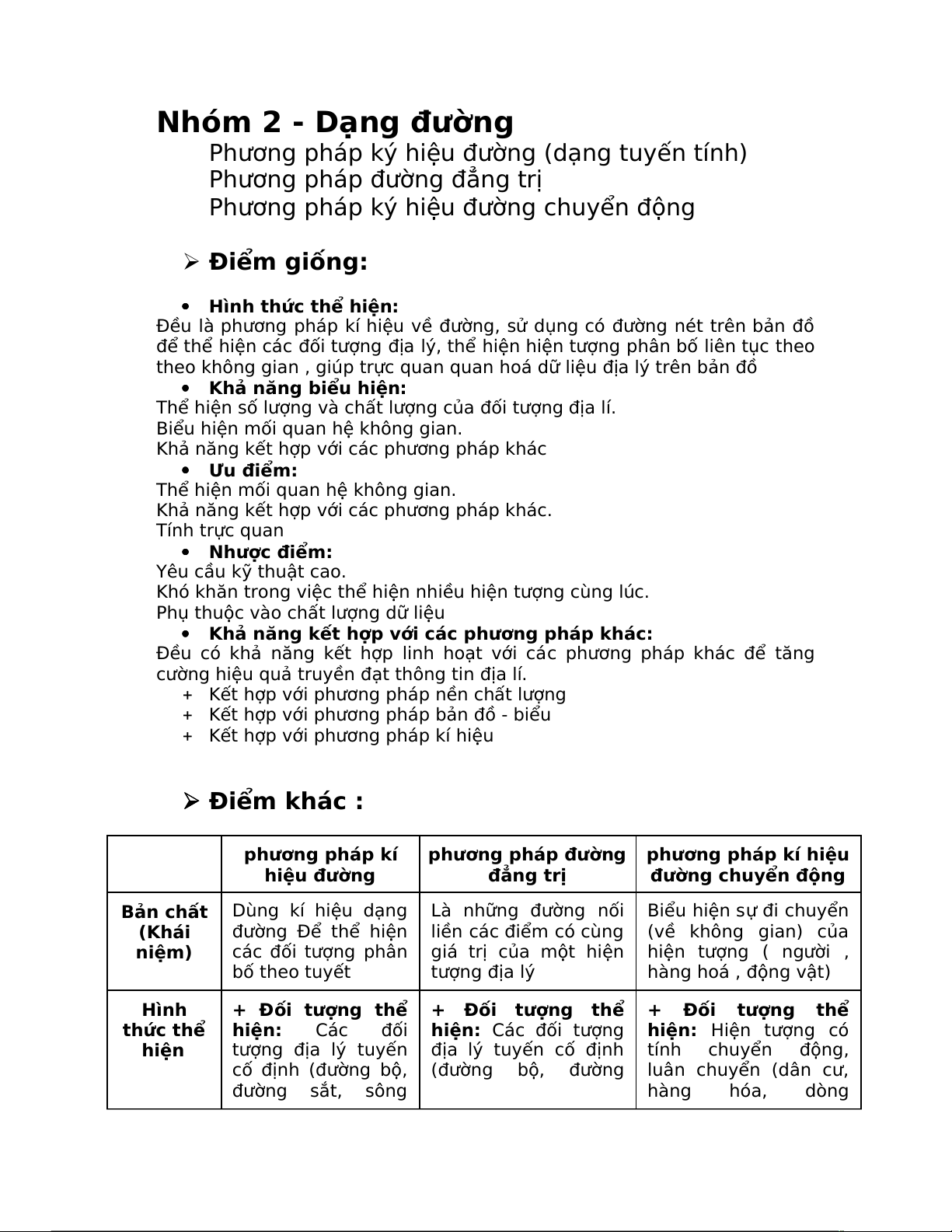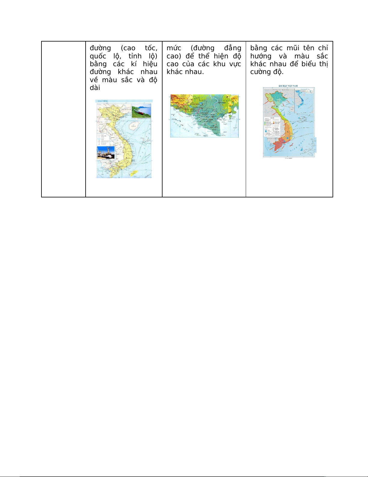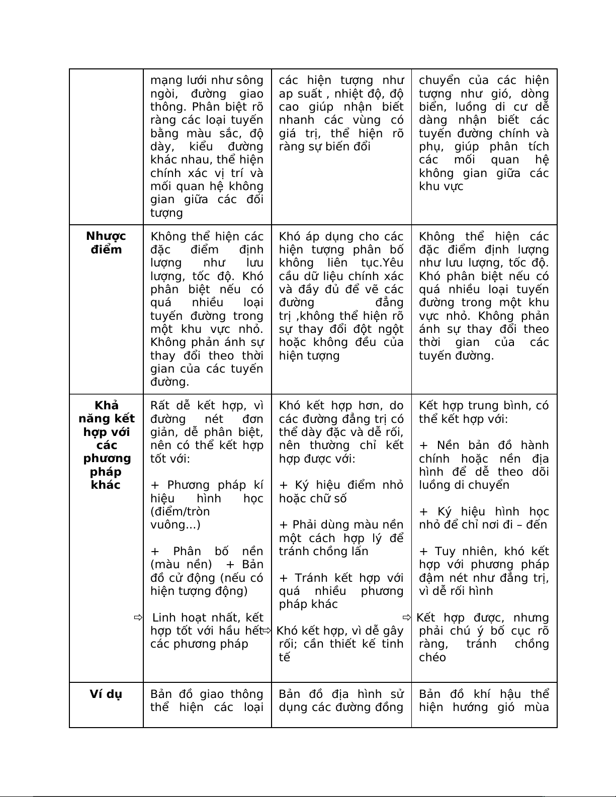 hợp tốt với hầu hết Khó kết hợp, vì dễ gây phải chú ý bố cục rõ các phương pháp rối; cần thiết kế tinh ràng, tránh chồng tế chéo Ví dụ Bản đồ giao thông Bản đồ địa hình sử Bản đồ khí hậu thể thể hiện các loại dụng các đường đồng hiện hướng gió mùa đường (cao tốc, mức (đường đẳng bằng các mũi tên chỉ quốc lộ, tỉnh lộ) cao) để thể hiện độ hướng và màu sắc bằng các kí hiệu cao của các khu vực khác nhau để biểu thị đường khác nhau khác nhau. cường độ. về màu sắc và độ dài