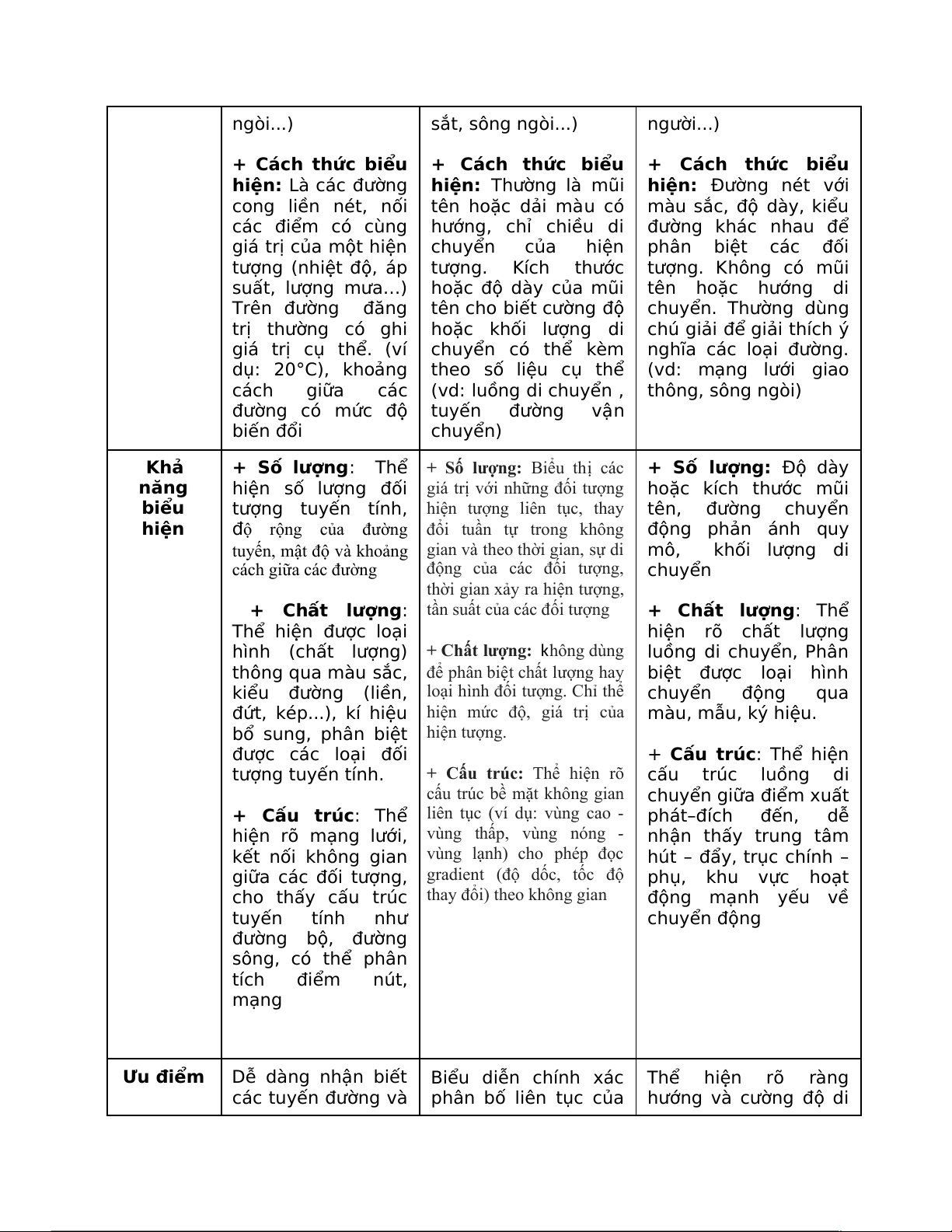 ap suất , nhiệt độ, độ tượng như gió, dòng thông. Phân biệt rõ cao giúp nhận biết biển, luồng di cư dễ ràng các loại tuyến nhanh các vùng có dàng nhận biết các bằng màu sắc, độ giá trị, thể hiện rõ tuyến đường chính và dày, kiểu đường ràng sự biến đổi phụ, giúp phân tích khác nhau, thể hiện các mối quan hệ chính xác vị trí và không gian giữa các mối quan hệ không khu vực gian giữa các đối tượng Nhược Không thể hiện các Khó áp dụng cho các Không thể hiện các điểm đặc điểm định hiện tượng phân bố