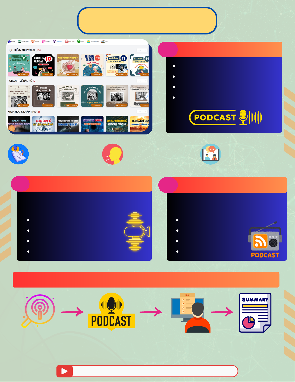 trường học tập toàn diện, đa chiều podcast, tài liệu và test.