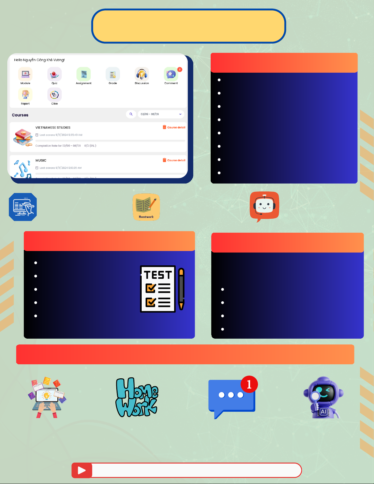 THEO DÕI HỌC TẬP TRÊN LMS Xem nội dung Làm bài tập Theo dõi thông báo Nhờ AI Tutor học tập các môn về nhà đúng tiến độ của giáo viên trên LMS giải bài tập khó