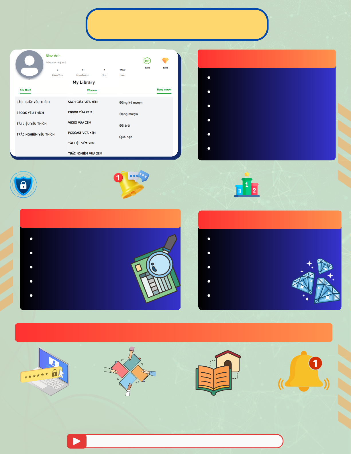 Xem video hướng dẫn làm bài tập LMS trong TVS QUẢN LÝ TÀI KHOẢN QUẢN LÝ TÀI KHOẢN Profile thành viên Đăng nhập/Đăng xuất Thay đổi Avatar Đổi mật khẩu Bài tập LMS được giao Thông báo thư viện Bảo vệ thông tin Thông báo kịp thời Xếp hạng thành viên cá nhân cao với và thống kê chi tiết tích cực theo lớp, nhiều mức ATTT. các hoạt động. khối và toàn trường.