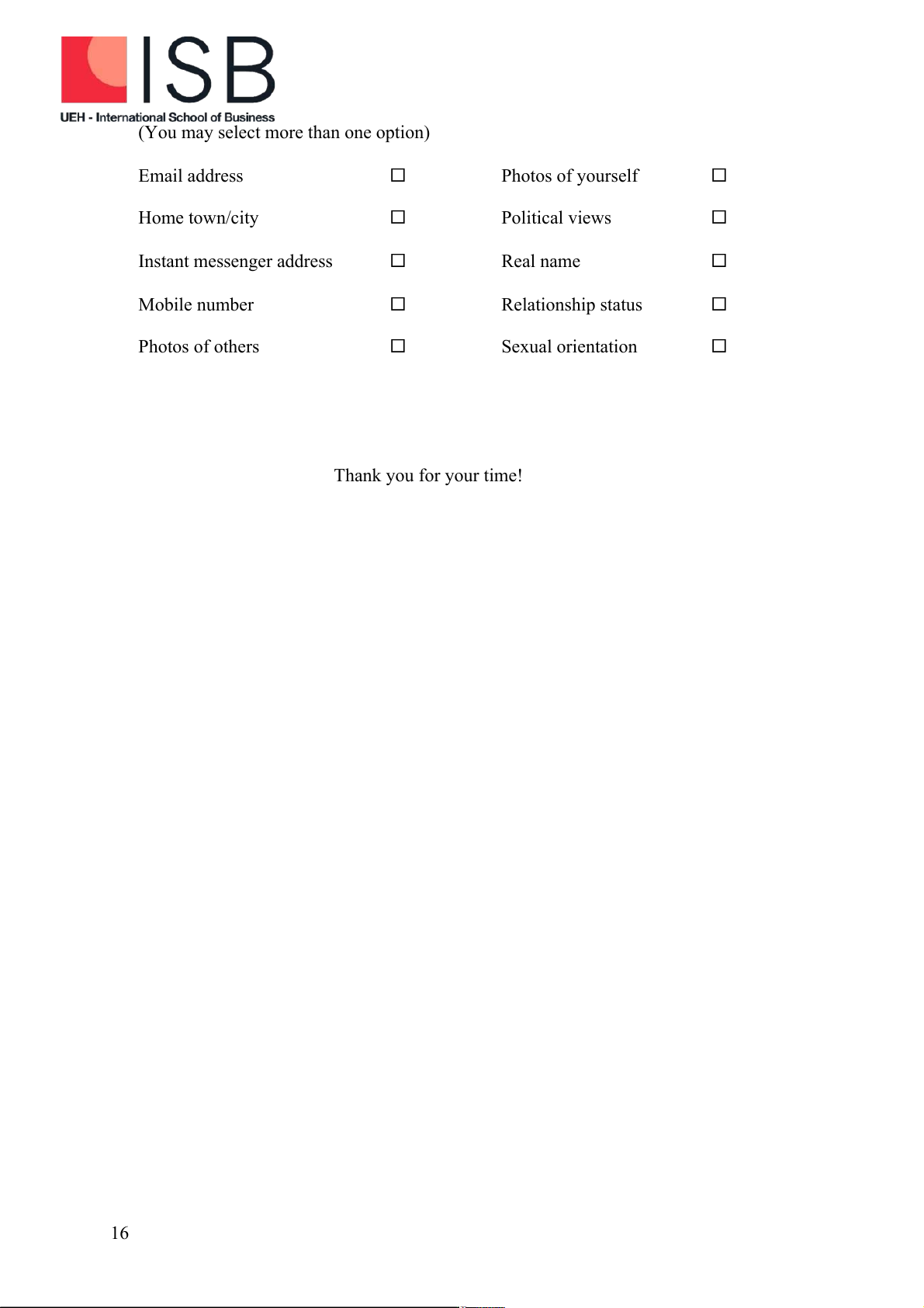 (You may select more than one option) Email address Photos of yourself Home town/city Political views Instant messenger address Real name Mobile number Relationship status Photos of others Sexual orientation Thank you for your time! 16