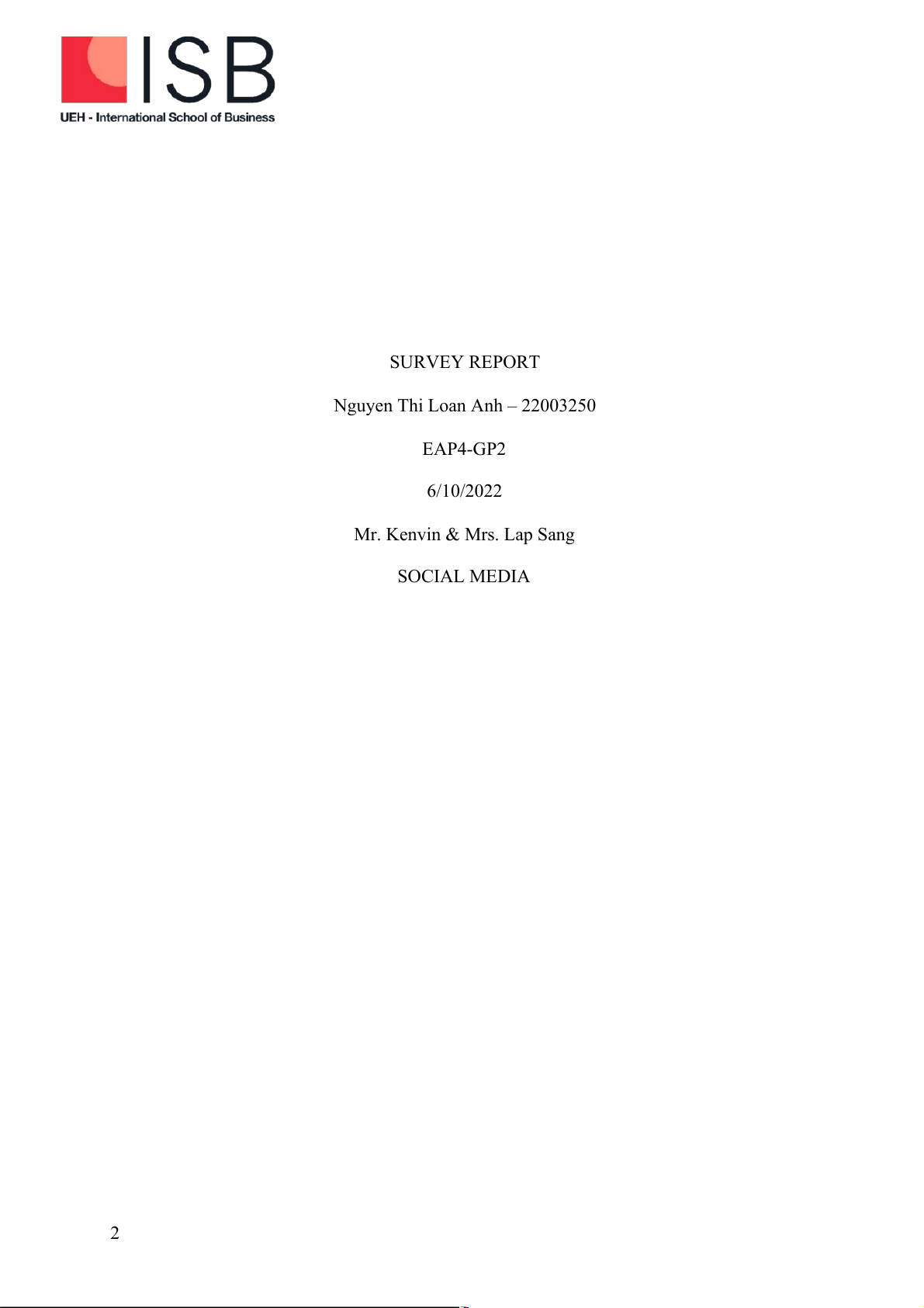 Nguyen Thi Loan Anh – 22003250 EAP4-GP2 6/10/2022 Mr. Kenvin & Mrs. Lap Sang SOCIAL MEDIA 2 Contents Introduction 3 Methodology 4 Results 5