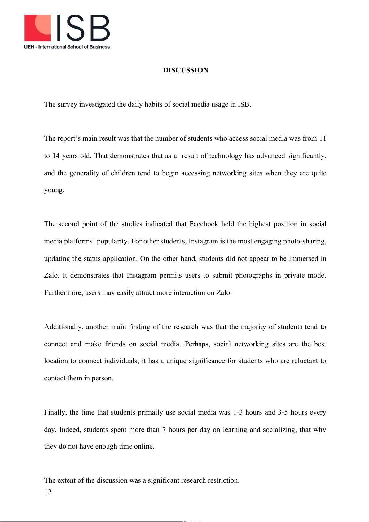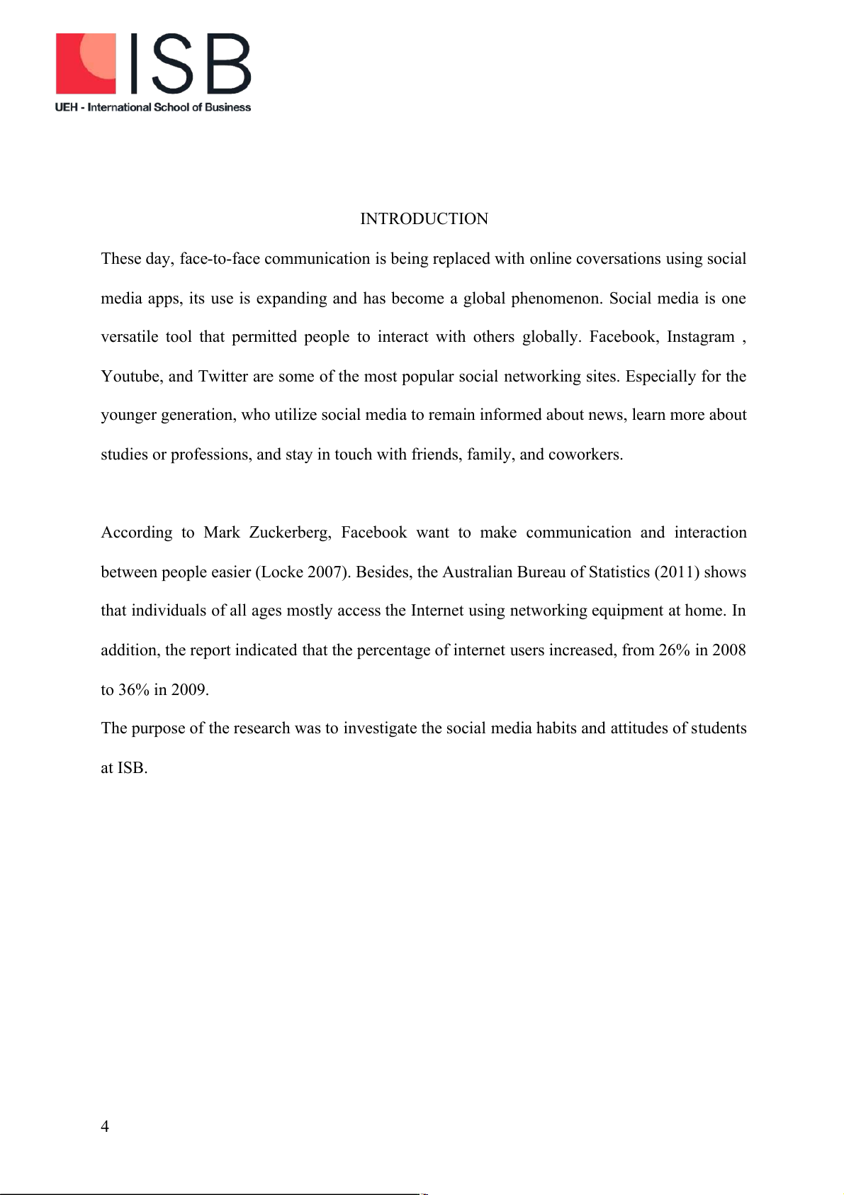 The purpose of the research was to investigate the social media habits and attitudes of students at ISB. 4 METHODOLOGY