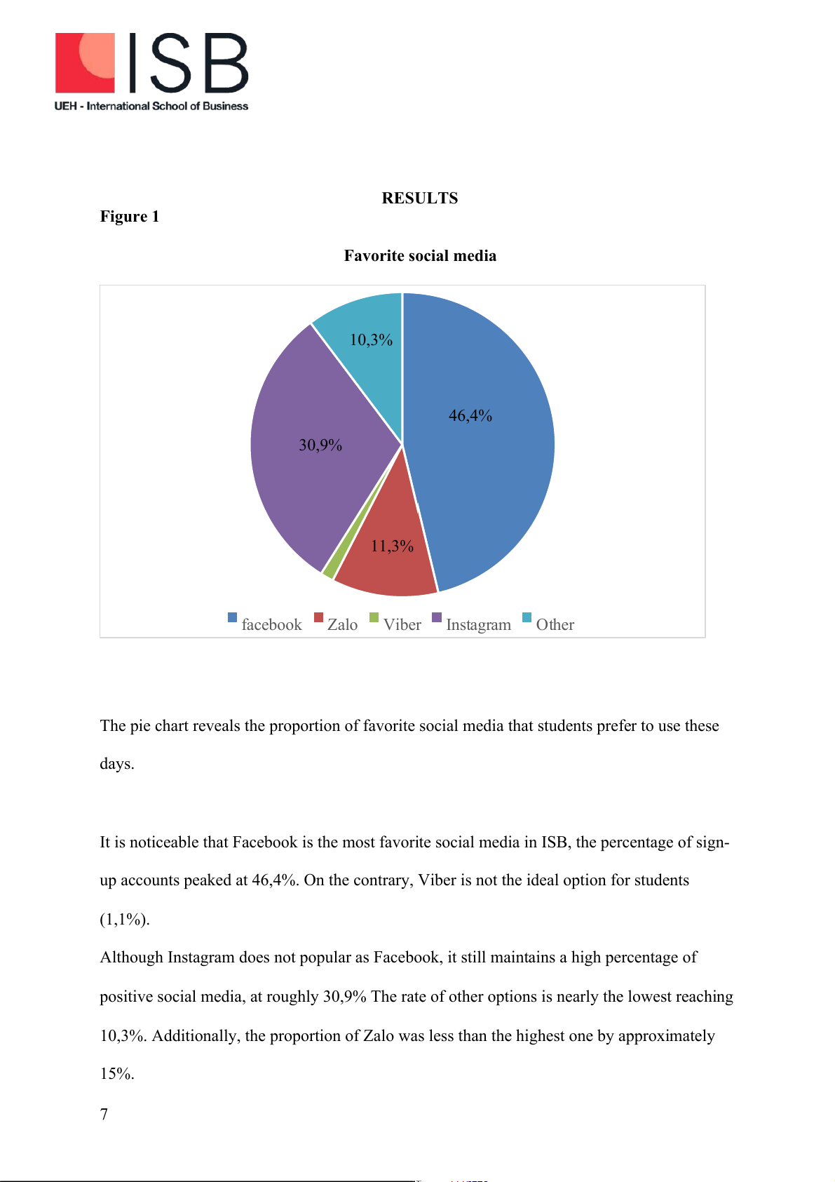 The data was then collated and covered into percentages in chart form for analysis. 5 6 RESULTS Figure 1 Favorite social media 10,3% 46,4% 30,9% 11,3% facebook Zalo Viber Instagram Other