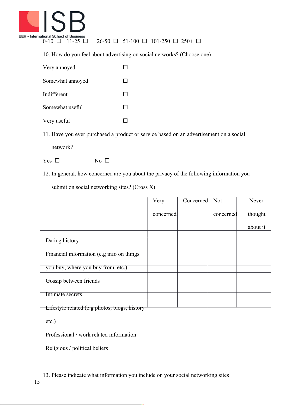 10. How do you feel about advertising on social networks? (Choose one) Very annoyed Somewhat annoyed Indifferent Somewhat useful Very useful