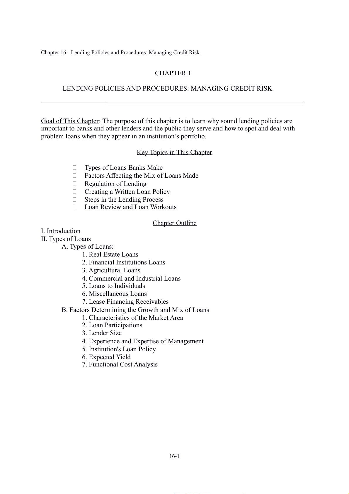 Chapter 16 - Lending Policies and Procedures: Managing Credit Risk CHAPTER 1