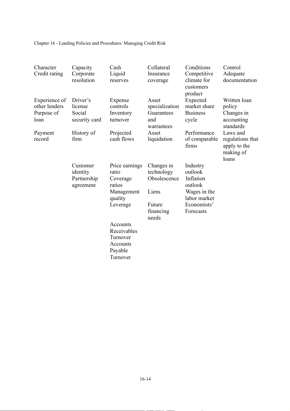 Chapter 16 - Lending Policies and Procedures: Managing Credit Risk Character Capacity Cash Collateral Conditions Control Credit rating Corporate Liquid Insurance Competitive Adequate resolution reserves coverage climate for documentation customers product Experience of Driver’s Expense Asset Expected Written loan other lenders license controls specialization market share policy Purpose of Social Inventory Guarantees Business Changes in loan security card turnover and cycle accounting warrantees standards Payment History of Projected Asset Performance Laws and record firm cash flows liquidation of comparable regulations that firms apply to the making of loans Customer Price earnings Changes in Industry identity ratio technology outlook Partnership Coverage Obsolescence Inflation agreement ratios outlook Management Liens Wages in the quality labor market Leverage Future Economists’ financing Forecasts needs Accounts Receivables Turnover Accounts Payable Turnover 16-14