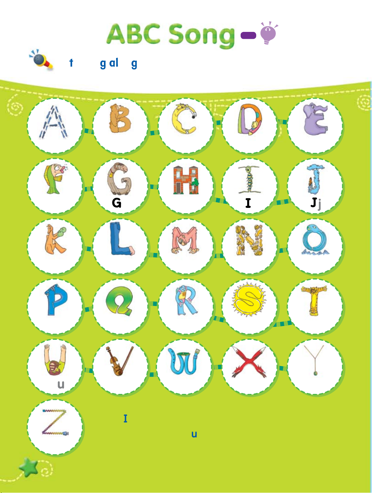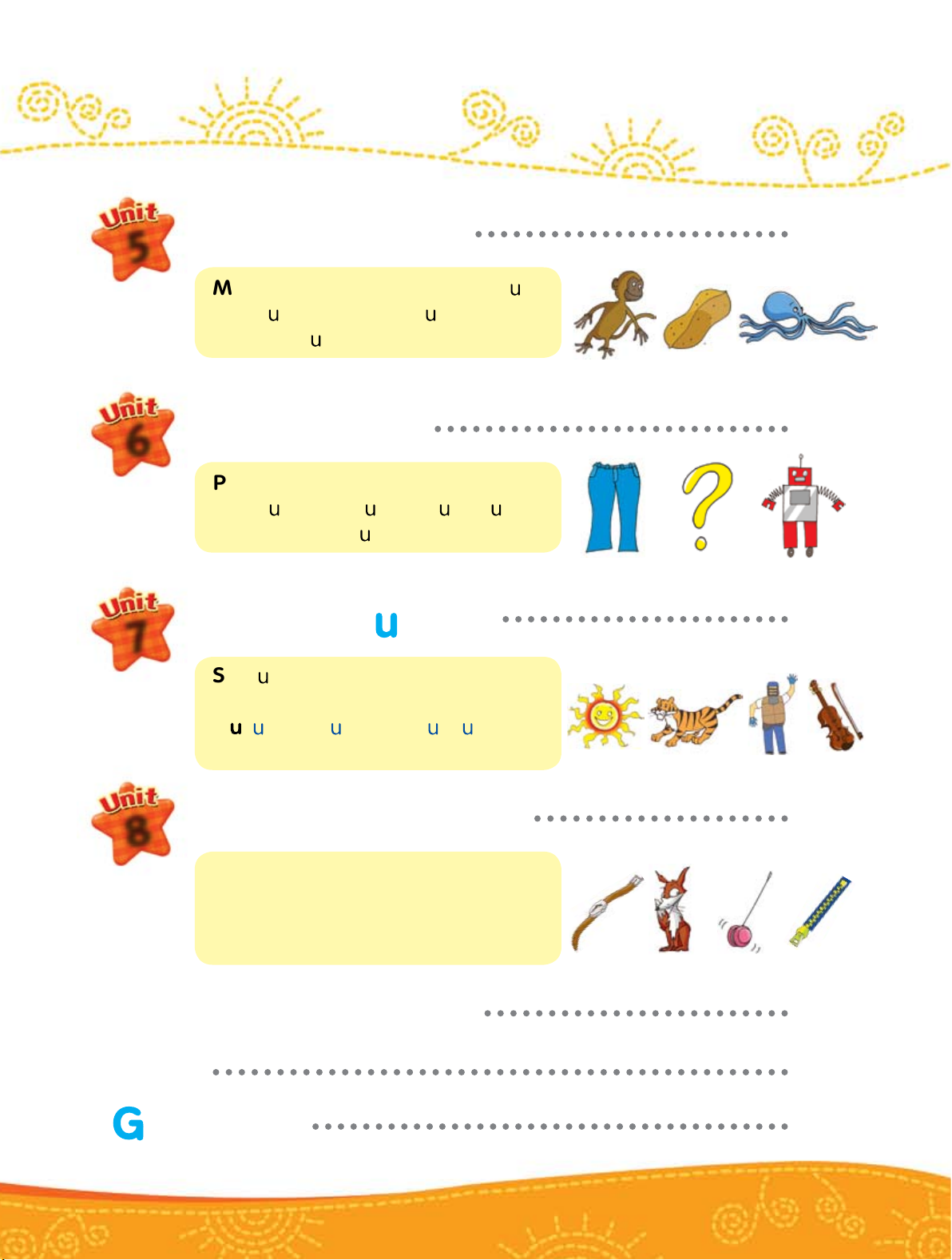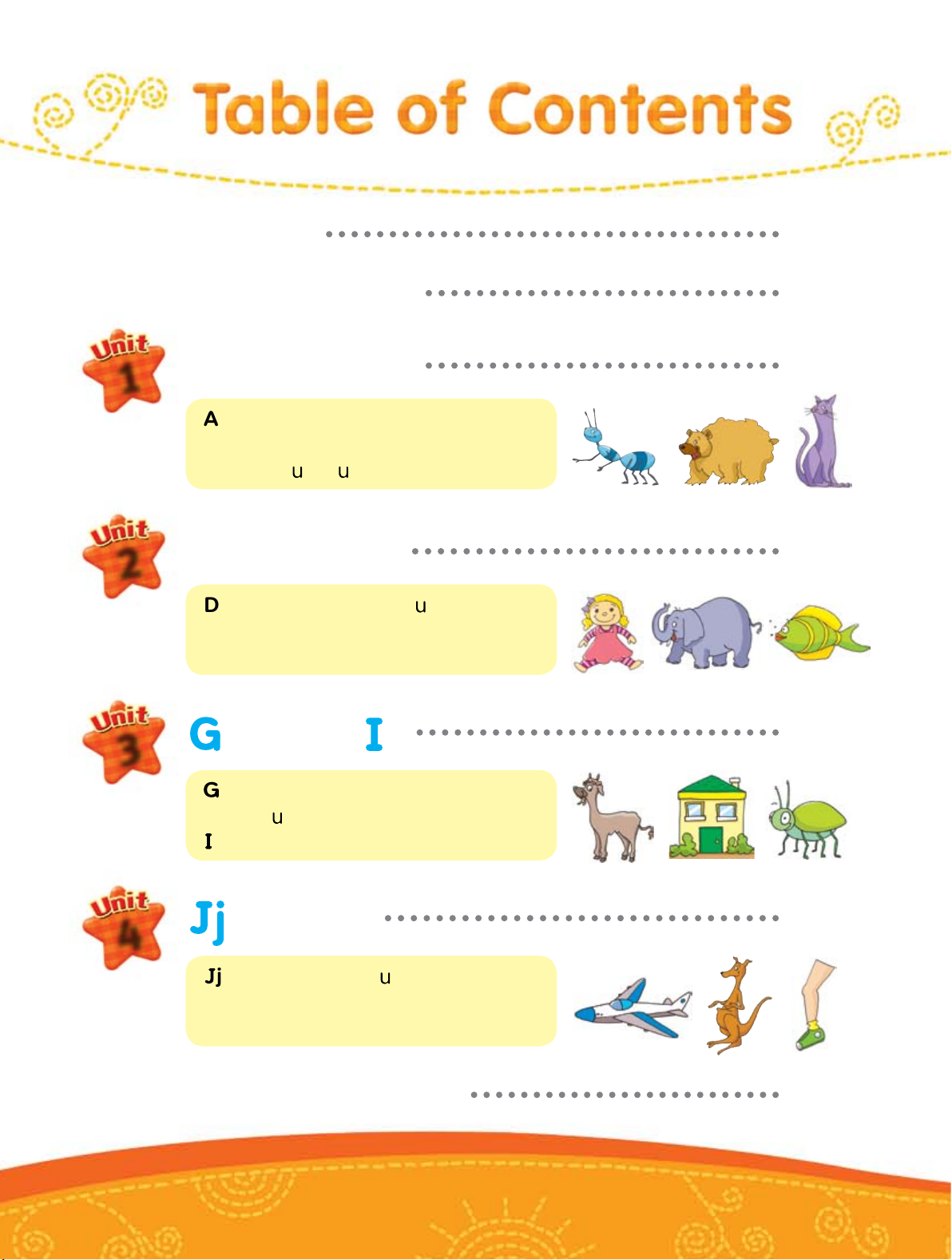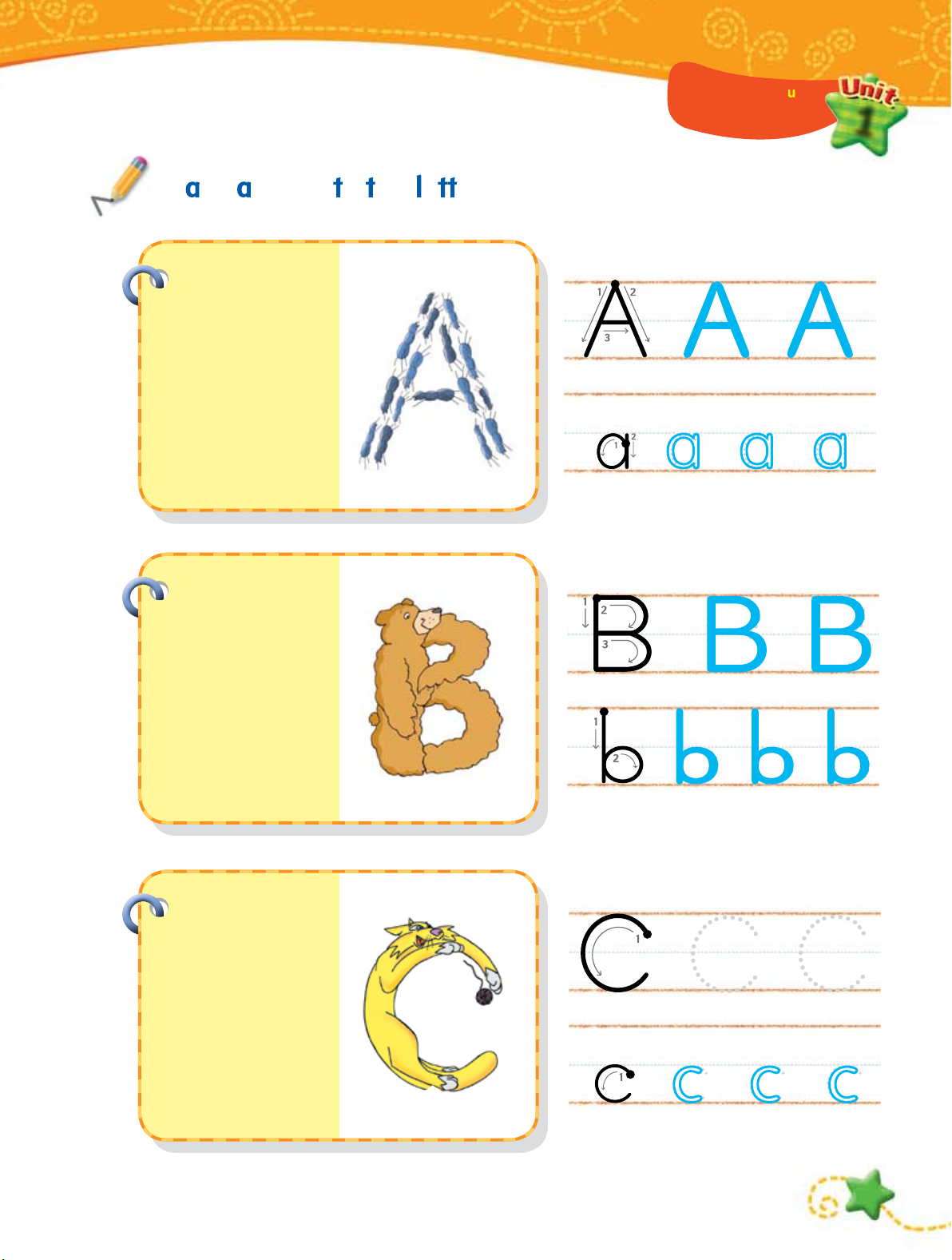 Qq: q estion, q een, q ilt, q iet Rr: robot, red, r n, ring Ss . Tt . U . Vv 60 7 Ss: s n, sea, sad, sit Tt: tiger, tall, ten, tire U : mpire, mbrella, p, nder Vv: violin, vest, van, vase Ww . Xx . Yy . Zz 68 8 Ww: watch, window, wash, water Xx: fox, box, six, fix Yy: yo-yo, yellow, yawn, yacht Zz: zipper, zebra, zoo, zero Review 2 (Units 5-8) 76 Test 80 lossary 84 Track CD 1 2 Le ’s sin on ! Aa Bb Cc Dd Ee Ff g Hh i Kk Ll Mm Nn Oo Pp Qq Rr Ss Tt U Vv Ww Xx Yy Now know my ABCs.
