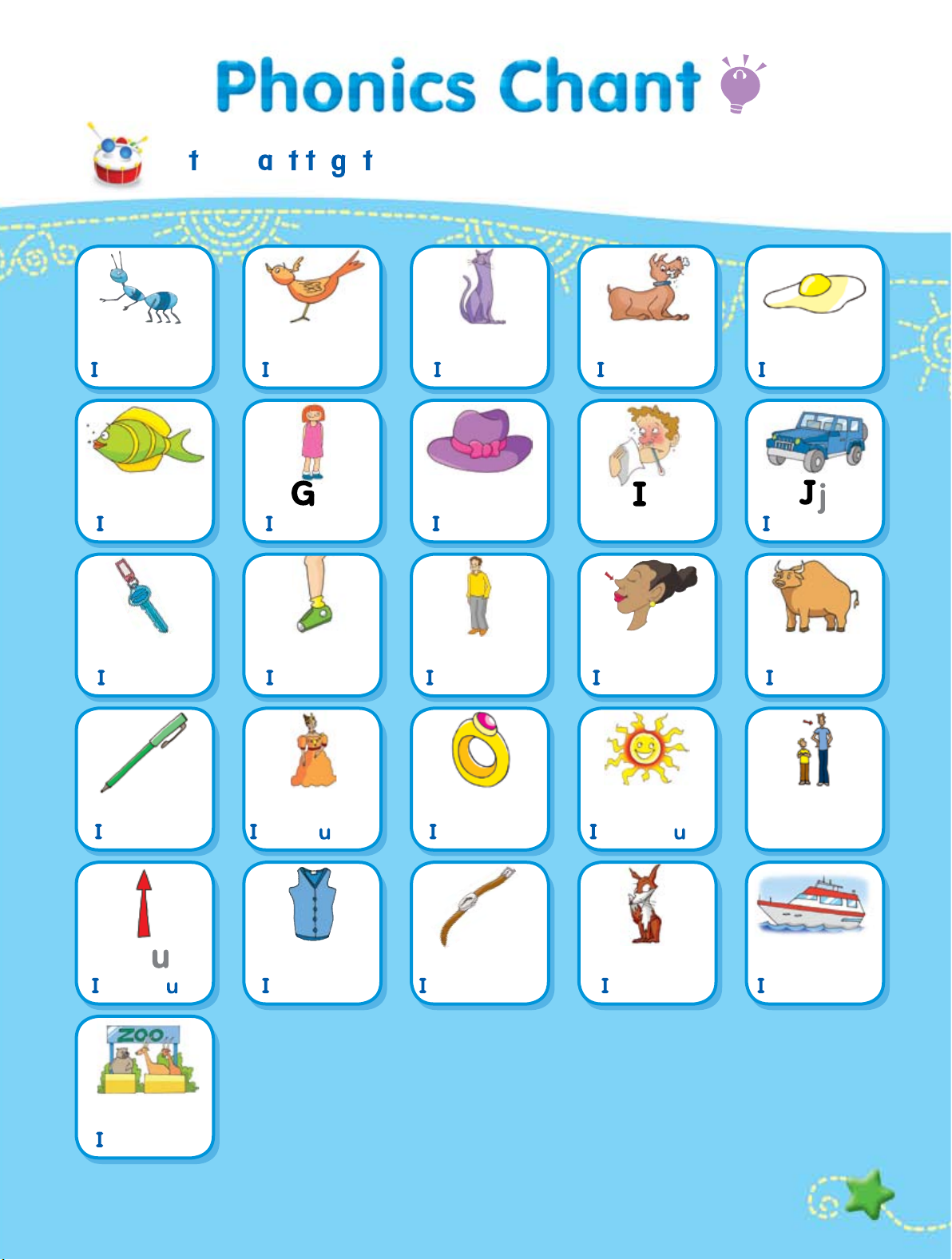 Next time won‘t yo sing with me? Zz 6 Track 3 Le ’s ch n o e her! Aa Bb Cc Dd Ee t’s an ant! t’s a bird! t’s a cat! t’s a dog! t’s an egg! Ff g Hh i t’s a fish! t’s a girl! t’s a hat! He is ill! t’s a jeep! Kk Ll Mm Nn Oo t’s a key! t’s a leg! t’s a man! t’s a nose! t’s an ox! Pp Qq Rr Ss Tt t’s a pen! t’s a q een! t’s a ring! t’s the s n! He is tall! U Vv Ww Xx Yy t goes p! t’s a vest! t’s a watch! t’s a fox! t’s a yacht! Zz t’s a zoo! 7 Single-Letter So nds 1 Aa . Aa Bb . . Bb Cc .