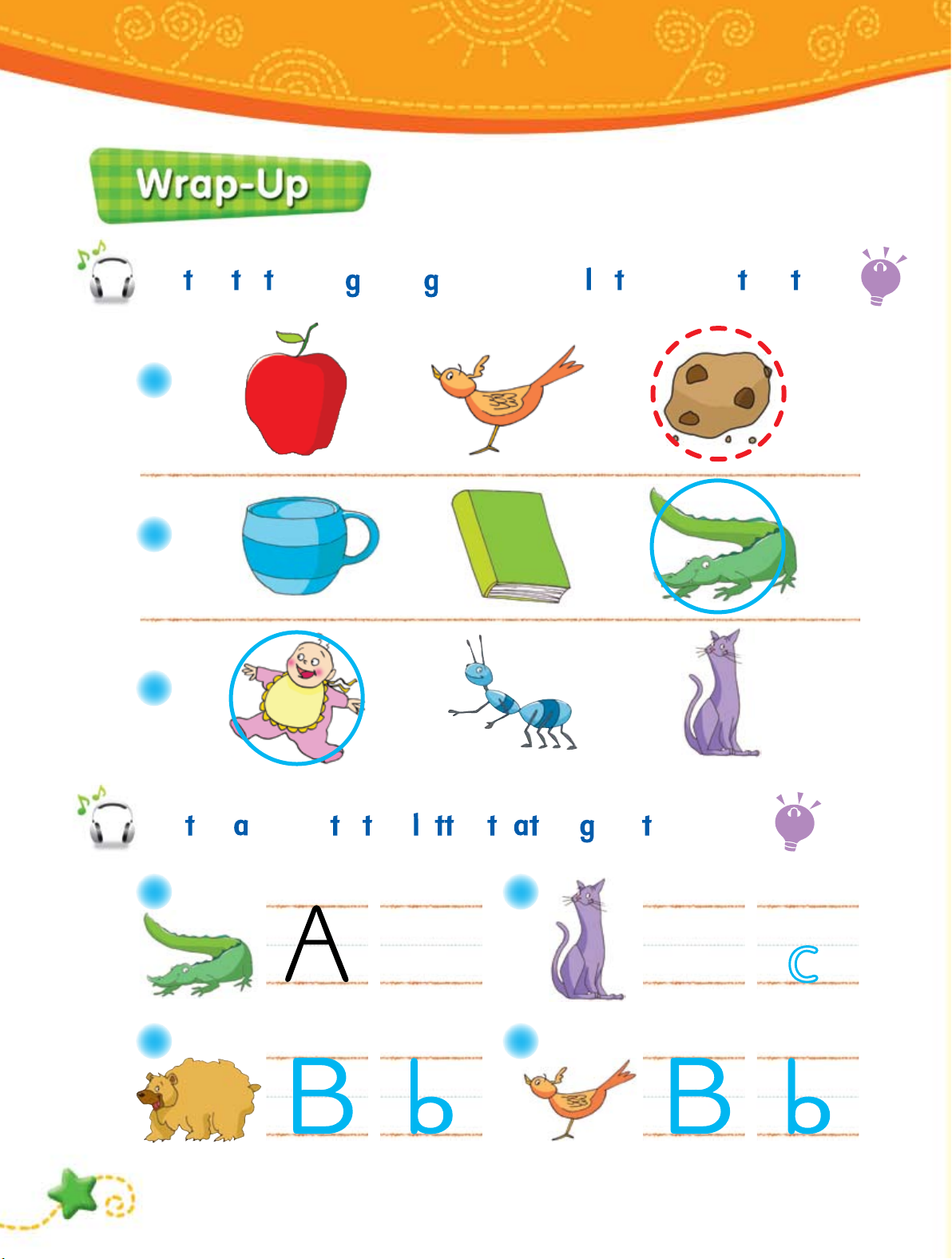 Lis en, poin , nd repe . Track6 Aa ant apple angry alligator Bb bear baby book bird Cc cat c p c t cookie