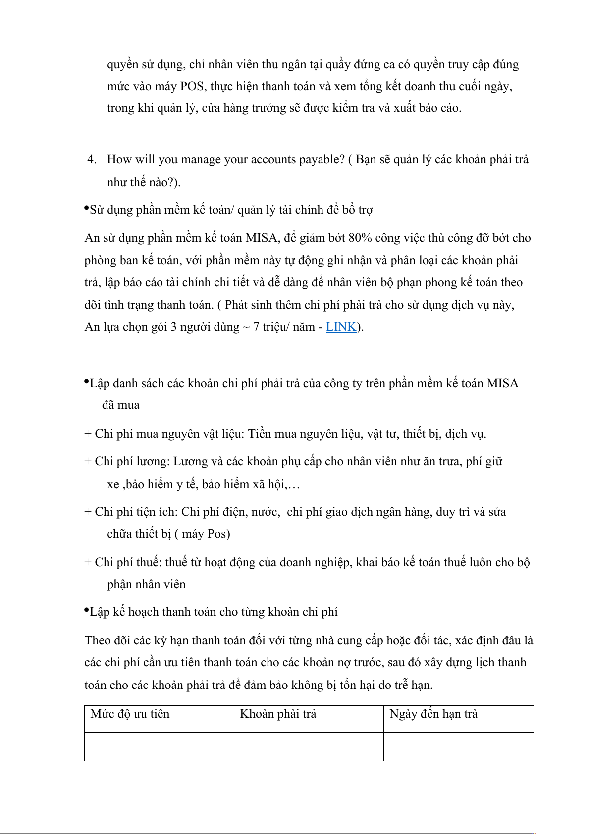 4. How will you manage your accounts payable? ( Bạn sẽ quản lý các khoản phải trả như thế nào?).